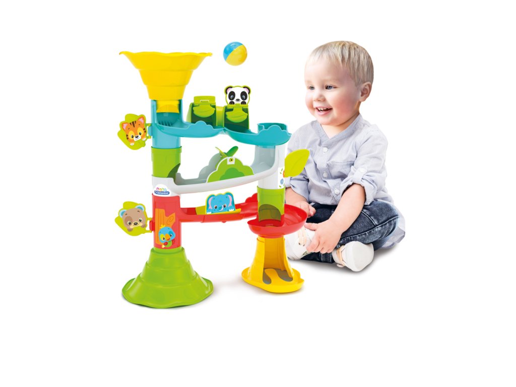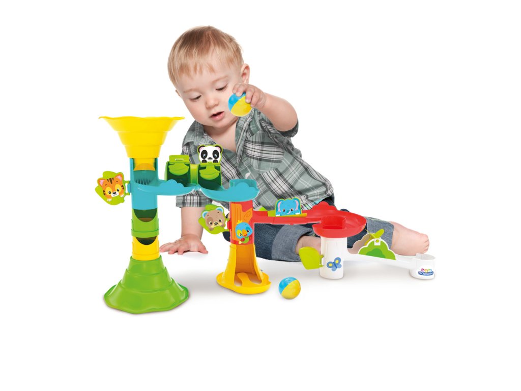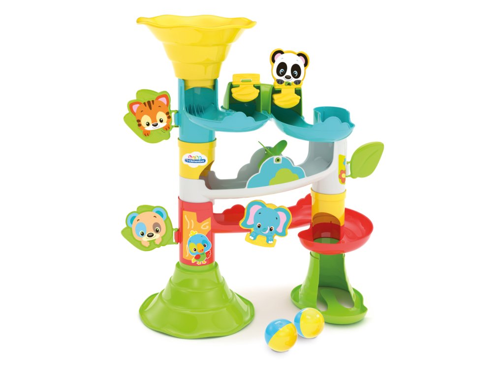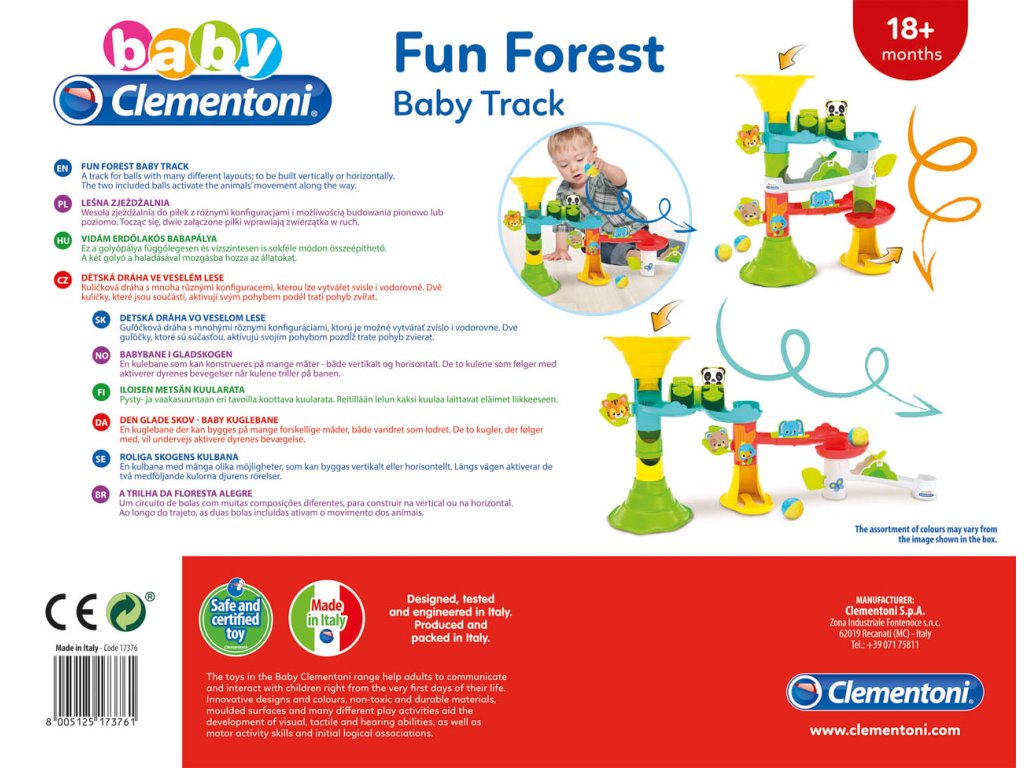 Zábavná CLEMENTONI Baby velká kuličková dráha se zvířátky pro batolata. Dráha lze seskládat více způsoby a lze tak vytvářet horizontální a vertikální trasy. Míček pohybující se po dráze míjí zvířátka, která vždy vtipně reagují. Hračka stimuluje rozvoj manuálních dovedností, rozpoznávaní vztahů mezi příčinou a následkem a vizuální vnímání. Dráha je vyrobena z pevného, barevného plastu a snadno se sestavuje. Sada obsahuje 2 kuličky a nálepky k ozdobení dráhy. Vyrobeno v Itálii. Věk: 18m+