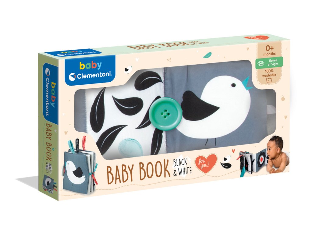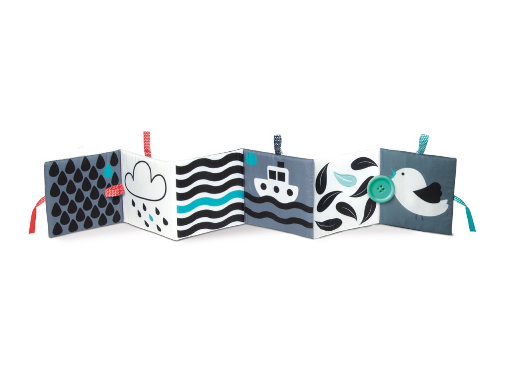 Měkká knížka s černobílými ilustracemi, které pomáhají rozvíjet zrakové vnímání u kojenců během prvních měsíců života. Kniha se otevře a na každé stránce je jiný obrázek a aktivita, jako je pískací nebo šustící látka, aby upoutaly pozornost dítěte a podpořily rozvoj sluchového vnímání. S barevnými stužkami pro uzavření měkké knihy, abyste ji mohli nosit všude s sebou. Rozměr balení: 31 x 16 x 4 cm Věk: 0+