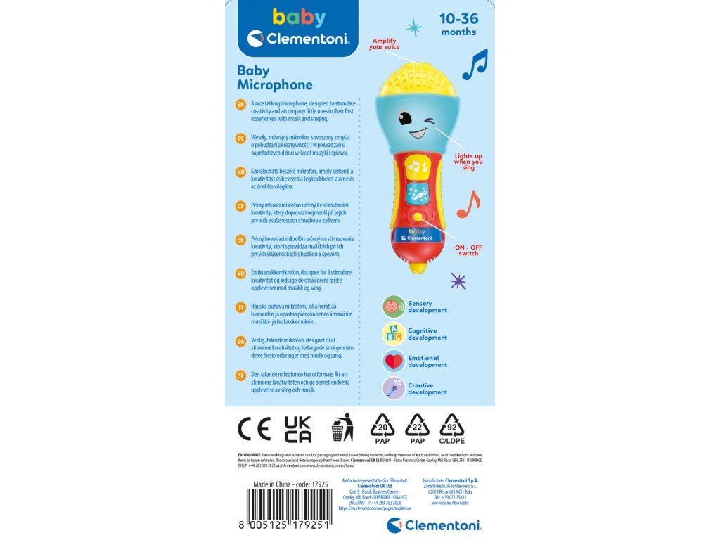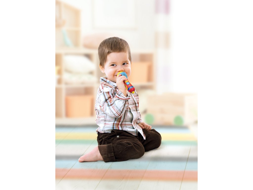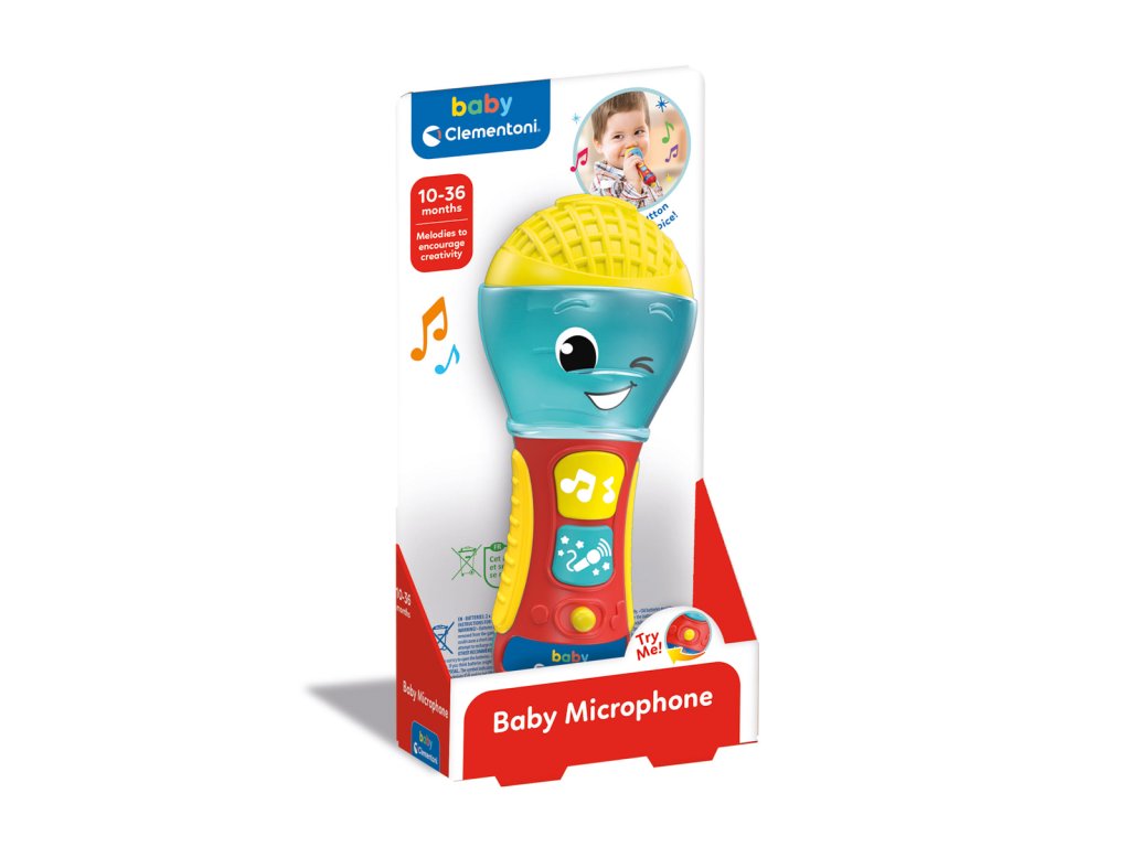 Dětský mikrofon je imitace hračky fungující jako skutečná: stisknutím modrého tlačítka zesílí dětský hlas. Přichází také se zvukovými efekty a hudbou. Mikrofon se při přehrávání hudby rozsvítí. Baterie: 2x AAA (součástí výrobku jsou baterie pouze demonstrativní účely). Věk: 10m+