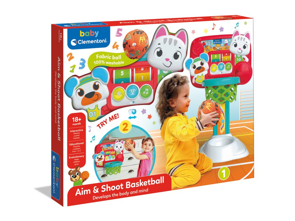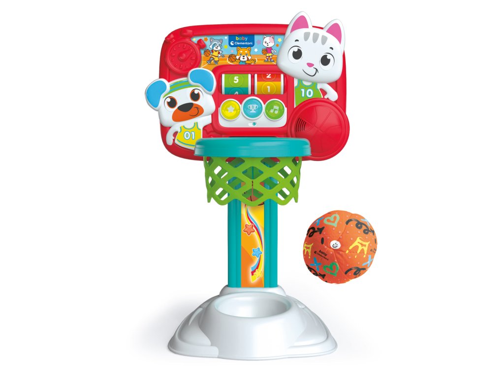 Basketbalový koš s látkovým míčem a interaktivní tabulí. Výškově nastavitelná základna a odnímatelná zadní deska k zavěšení na zeď v pokoji, až děti povyrostou. Obruč zaznamenává skóre a učí děti čísla a první slova. Tato hra stimuluje motoriku, manuální schopnosti a koordinaci. Vyrobeno z vysoce kvalitního plastu. Látkový míč je 100% omyvatelný. Rozměry balení: 40 x 50 x 7 cm. Věk: 18 m+