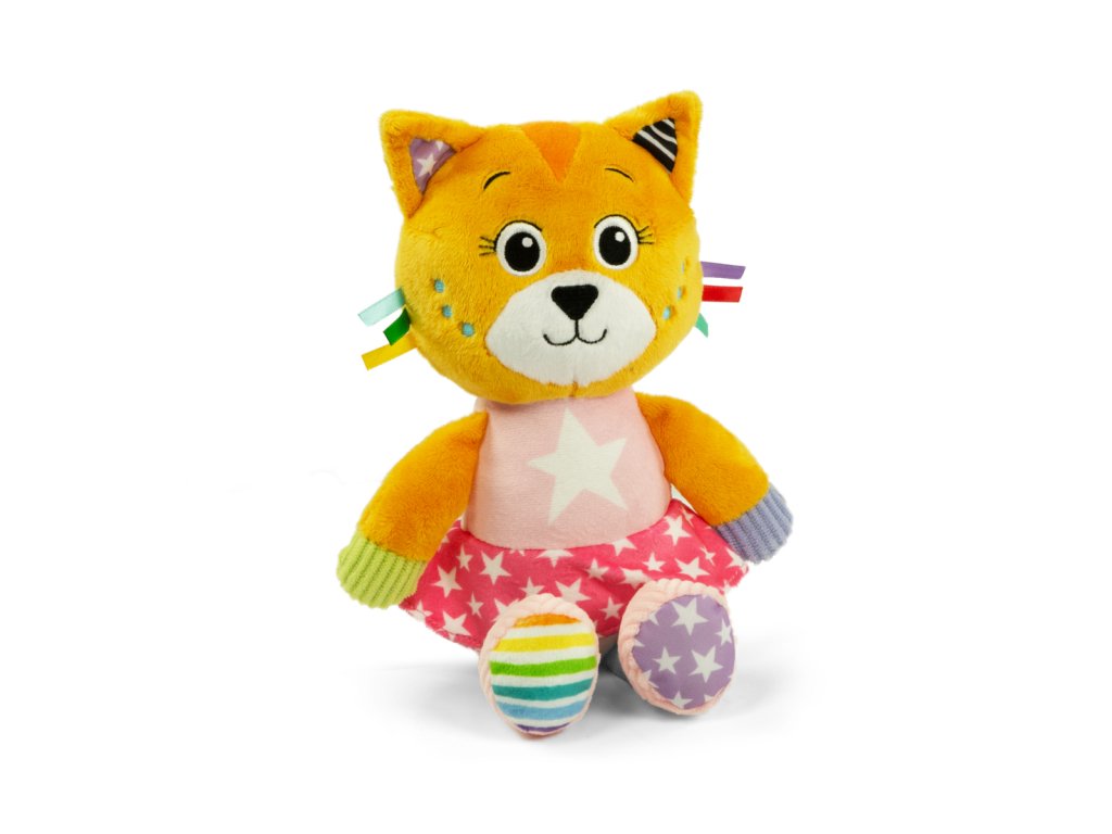 Ultra měkká plyšová kočka vhodná pro malé děti na hraní v atmosféře plné něhy. Plyšová hračka je vyrobena z různých materiálů napomáhajících multismyslové stimulaci a rozvoji hmatového vnímání v prvních fázích života. Plyšová hračka má malé kousátko, připravené speciálně pro kousání nejmenších uživatelů hračky. Lze prát v pračce. Rozměr balení: 16x22,5x8,5 cm. Věk 0m+