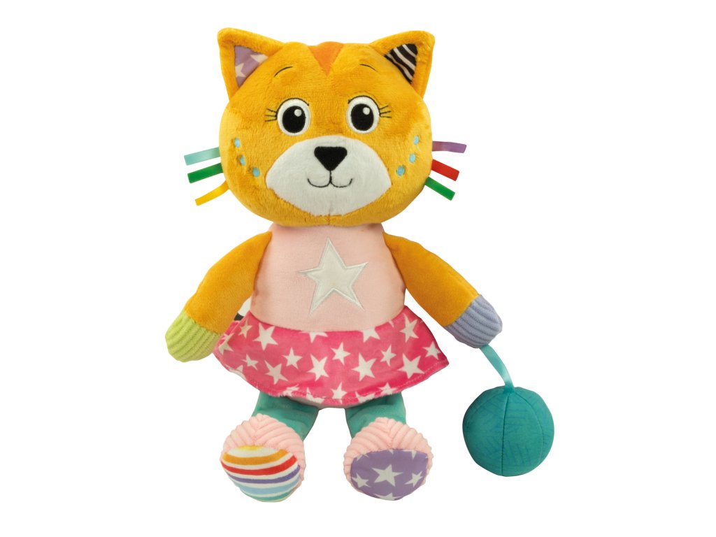 Zábavné plyšové kotě na mazlení, které se brzy stane nerozlučným kamarádem každého dítěte! Kotě je vyrobeno z několika různých materiálů pro posílení multismyslové stimulace dítěte. Dárková krabička je plná ilustrací a lze ji znovu použít pro hraní s plyšovou hračkou. Tato měkká kočička je dodávána s roztomilým míčkem s chrastítkem pro stimulaci sluchového vnímání a manuálních dovedností dítěte. Lze prát v pračce. Rozměry balení: 30x10,5x22cm. Věk: 0+
