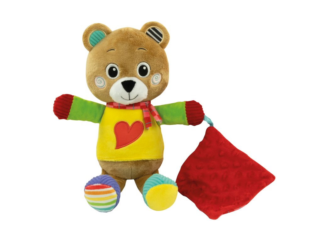 Ultra měkký plyšový medvídek vhodný pro malé děti na hraní v atmosféře plné něhy! Plyšová hračka je vyrobena z různých materiálů pro posílení multismyslové stimulace a umožňuje dětem rozvíjet hmatové vnímání v raných fázích jejich života. Dárková krabička obsahující plyšovou hračku je navržena a ilustrována tak, aby se dala použít i na hraní s plyšovým medvídkem. Tato plyšová hračka je dodávána s měkkou přikrývkou navrženou tak, aby absorbovala matčinu vůni a uklidnila dítě během fáze odpoutání. Lze prát v pračce. Rozměry balení: 30x10,5x22cm. Věk: 0+
