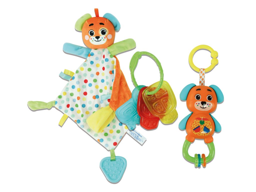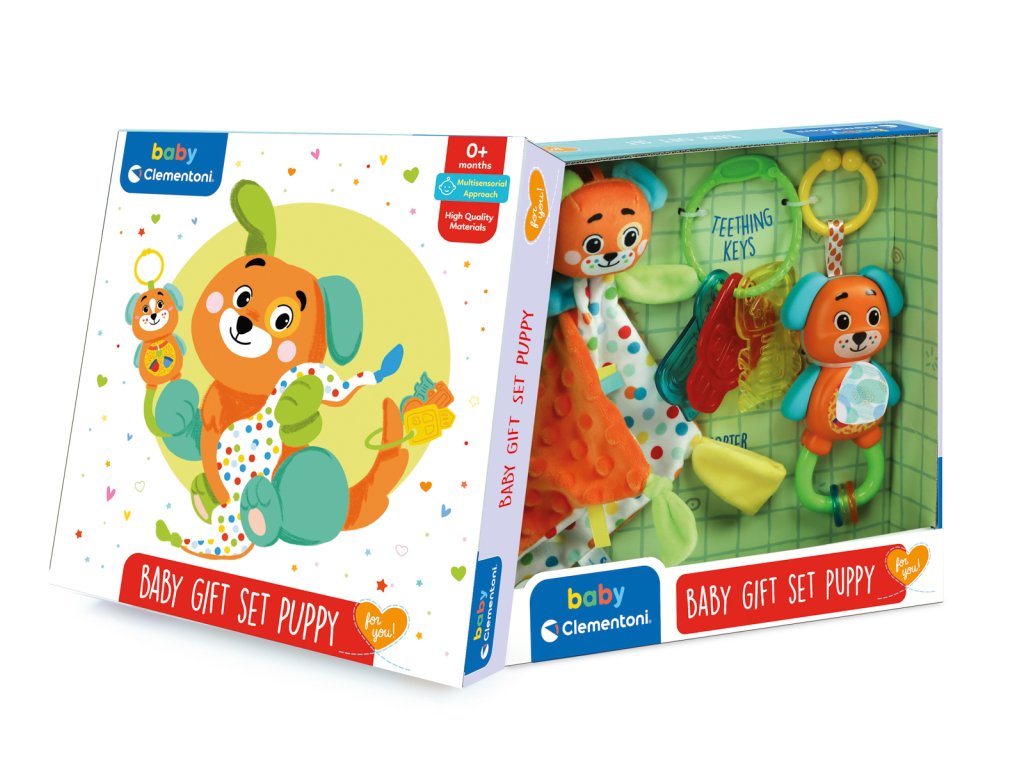 Sada se všemi náležitostmi pro přivítání novorozence tím nejlepším možným způsobem: něžné šidítko, barevné chrastítko a žvýkací klíče z měkkého plastu. Barevné chrastítko připomínající vystřiženého pejska plné gumových prvků a praktický kroužek na zavěšení. Žvýkací klíče podporují fázi chrupu, zatímco šidítko připomínající roztomilé štěňátko bude prvním společníkem dítěte na hraní. Jasné barvy, zvuky, mobilní prvky a různé materiály jsou navrženy tak, aby napomáhaly multismyslovému rozvoji dítěte. Rozměry balení: 29,7x5,3x29,7cm. Věk: 0+