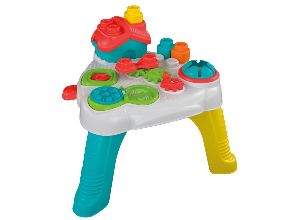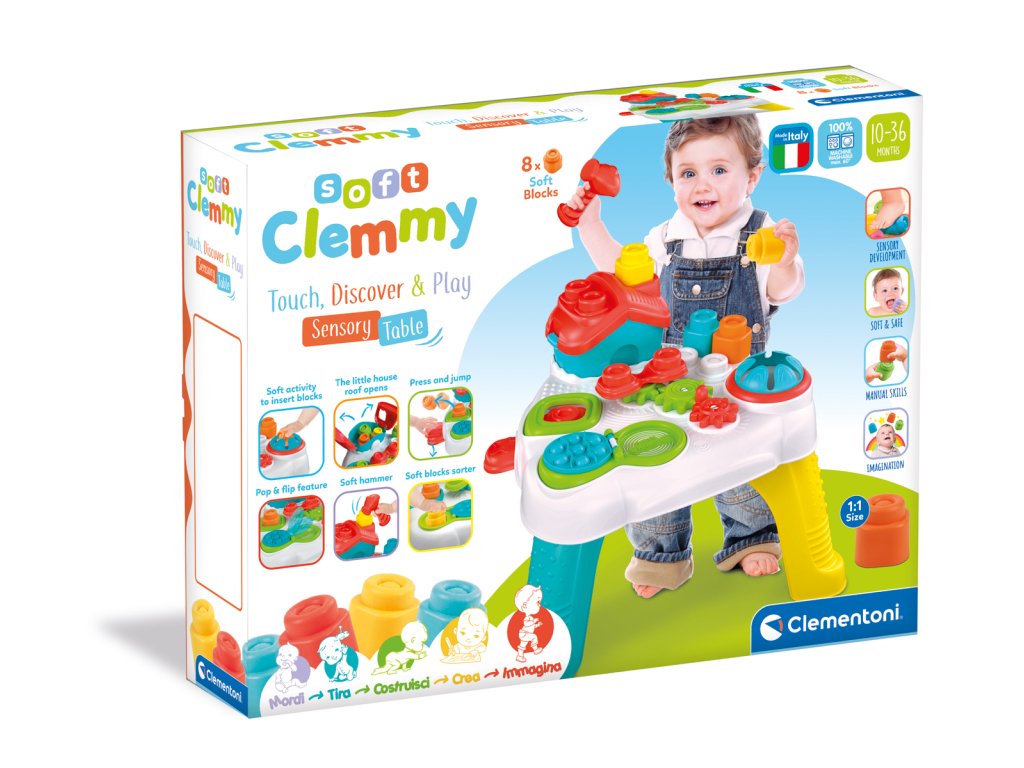 Stůl s aktivitami pro chvíle plné zábavy ve světě měkkosti... svět Clemmy bloků! Domeček tvoří praktickou nádobu na měkké bloky a otvor na střeše je ideální pro jejich vkládání. Mezi mnoha aktivitami je katapult, díky kterému bloky Clemmy „skákají“, zatímco kolečka otáčejí kolotočem, na kterém lze bloky poskládat. Dítě může použít štěrbiny k tomu, aby nechalo Clemmyho bloky spadnout do dutin nohou stolu a poté je znovu získalo, přičemž se v procesu vypořádá se vztahem příčiny a následku. Brožura s pop-it aktivitami stimuluje manuální schopnosti dítěte, které si také může „měkkým“ kladívkem hrát s katapultem nebo snadněji zasouvat bloky Clemmy do otvorů. Rozměr balení: 58 x 44 x 12,5 cm Věk: 10m+