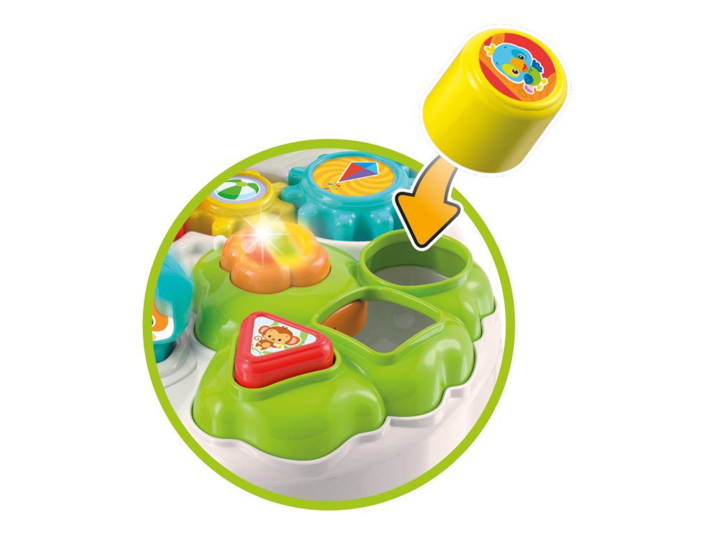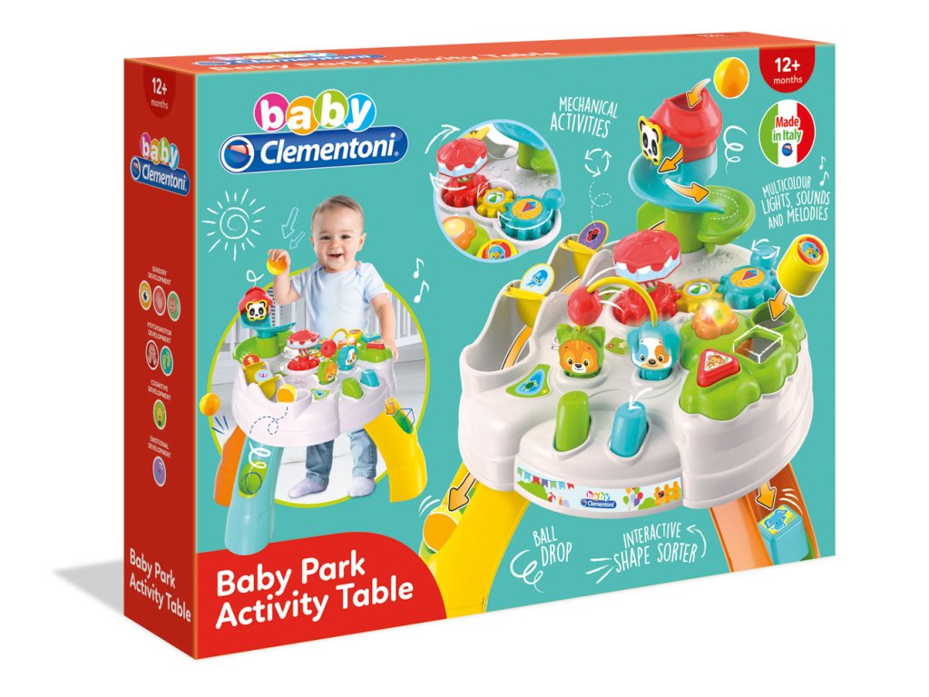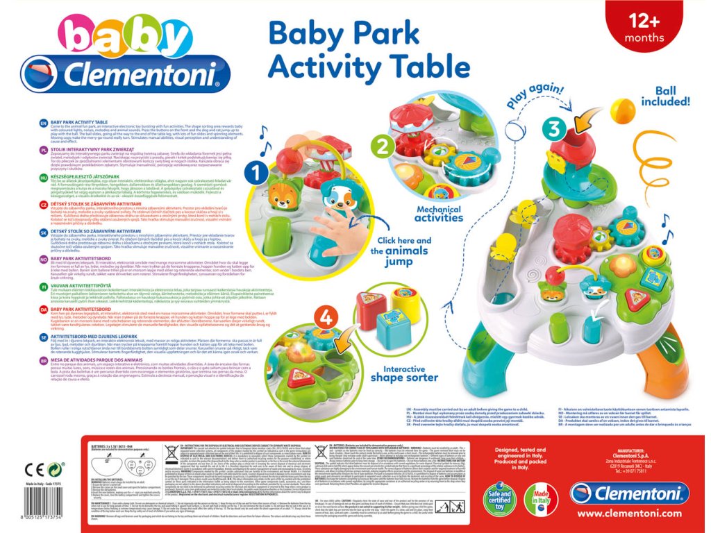 CLEMENTONI Clemmy baby - Veselý hrací stolek s kostkami a zvířátky zabaví Vaše děti po dlouhý čas. Hrací stoleček s mnoha aktivitami, jejichž cílem je stimulovat interakci s dítětem. Vkládací tvary se světly a zvuky, otáčející se ozubená kolečka a tlačítka ovládající pejska a kočku. Součástí stolku je zábavná trasa pro míčky se spoustou úžasných skluzavek a překážek. Míčky končí svou jízdu v noze stolku. Hračka stimuluje manuální dovednosti, vizuální vnímání a rozpoznávání vztahu mezi příčinou a následkem. Baterie: 3x1,5V AG13/R44 (součástí výrobku jsou baterie pouze demonstrativní účely). Rozměr balení: 58 x 44 x 12,5 cm. Věk: 12m+