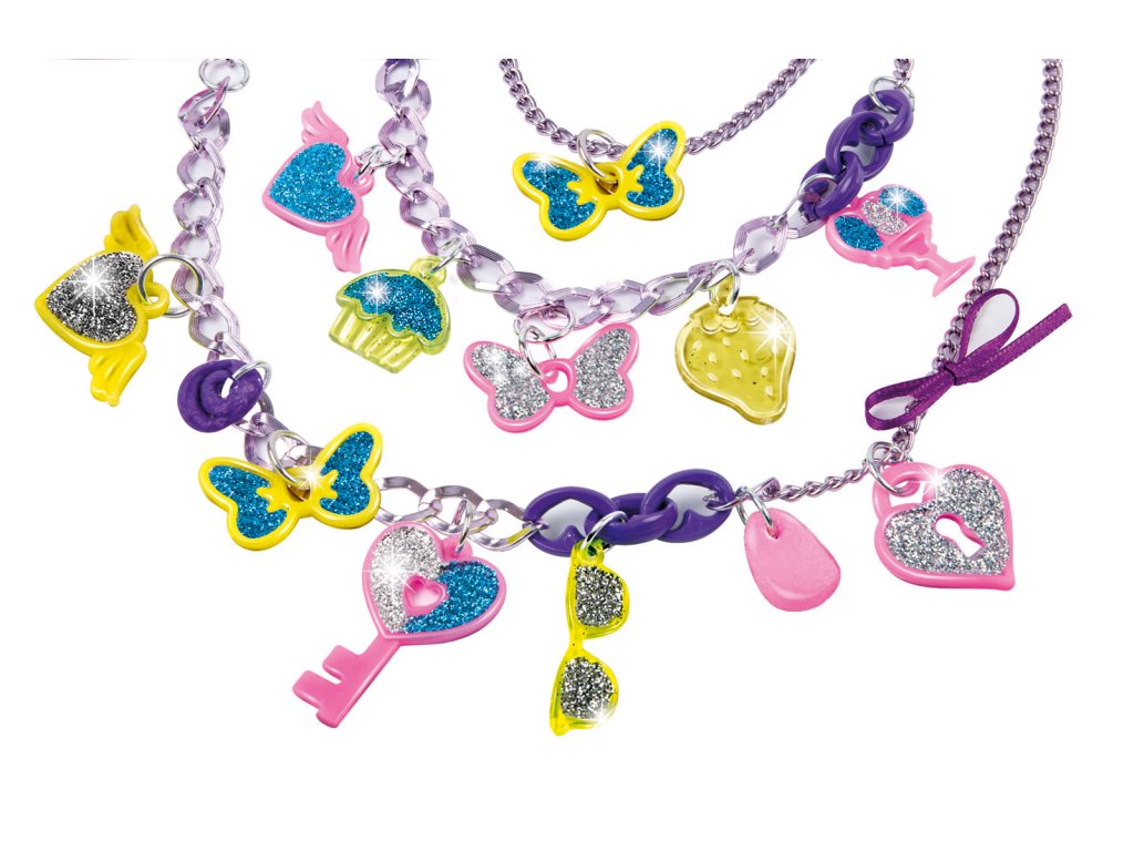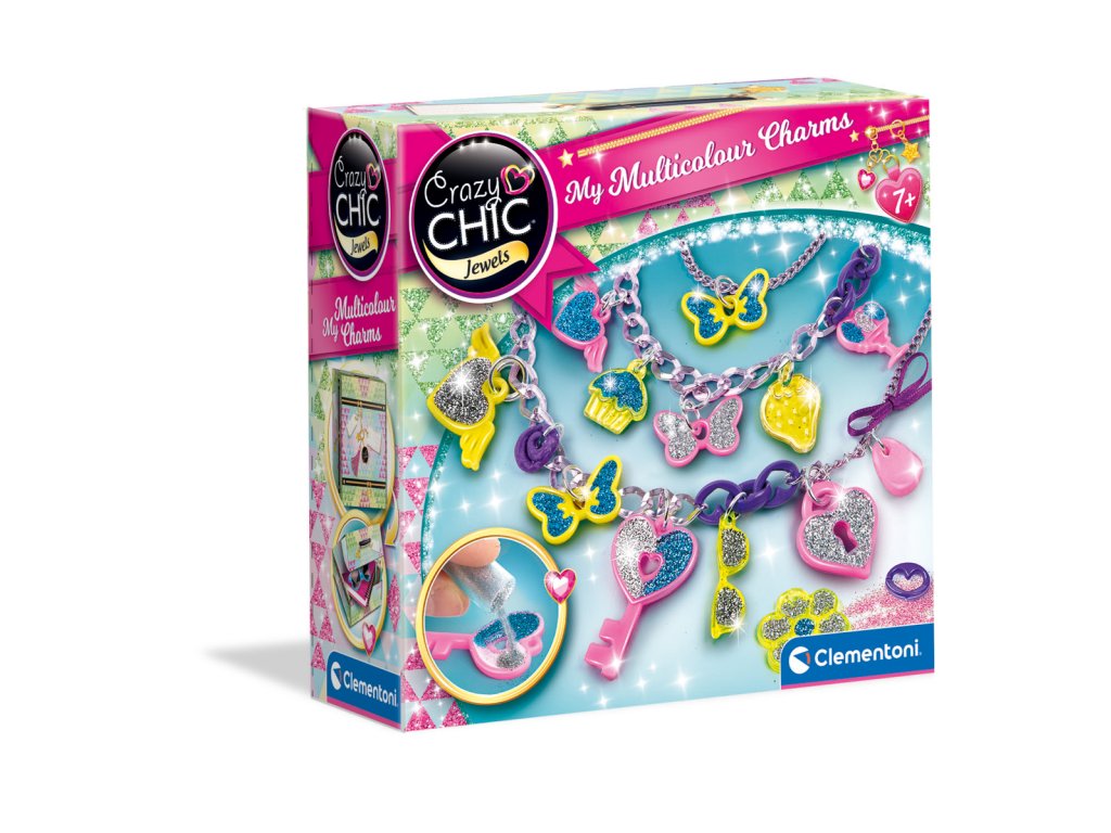 Bavte se s přívěsky Crazy Chic a jejich supertrendovými barvami! Sada obsahuje: hliníkové náhrdelníky a prsteny, spoustu superbarevných přívěsků, které lze ozdobit třpytkami a formovací hmotou pro vytvoření spousty korálků. Objevte všechny různé kombinace a vytvořte šperky s neonovým efektem! Rozměr balení: 18 x 18 x 6 cm Věk: 7+