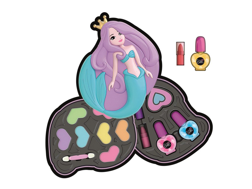 Tuto fantastickou sadu líčidel, v praktickém pouzdru, ve tvaru mořské panny se zlatou korunou, si zamilují všechny malé dívky. Sada obsahuje 2 trendy oční stíny, mini rtěnky a laky na nehty. Líčidla jsou bezpečná. Herní sada stimuluje kreativitu a manuální dovednost mladých dívek v oblasti krásy a kosmetiky. Rozměr balení: 34 x 30 x 6 cm. Věk: 6+
