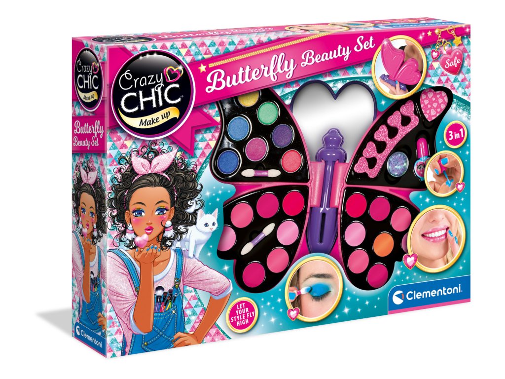Crazy CHIC fantastická sada Make-upu ve tvaru motýlka obsahuje vše potřebné pro perfektní vzhled. Barvy na vlasy, lak nehty, oční stíny a rtěnky. Zářivé barvy jsou vhodné pro všechny příležitosti. Rozměr balení: 47,9 x 50 x 9 cm. Věk: 6+