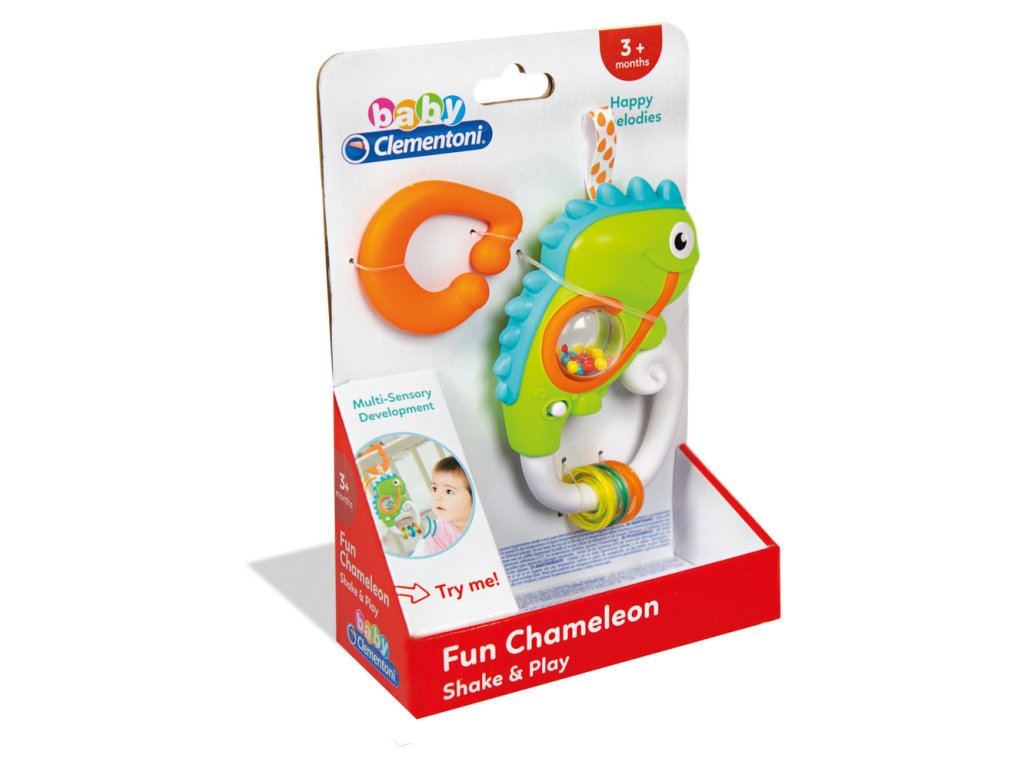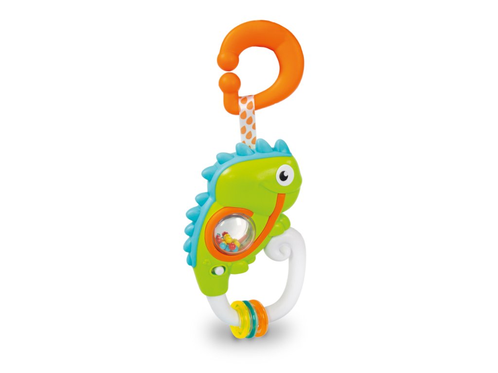 Clementoni interaktivní chrastítko chameleon skvěle zabaví vaše děťátko. Zatřes chrastítkem a aktivuj zábavné melodie a zvukové efekty. Praktický kroužek na zavěšení do postýlky, kočárku nebo autosedačky. Chrastítko, přívěsky a různé druhy povrchů podporují rozvoj smyslů dítěte. Vyrobeno z kvalitního a nezávadného materiálu. Baterie: 3 x 1,5V AG13/R44 (součástí výrobku jsou baterie pouze demonstrativní účely). Věk: 3m+