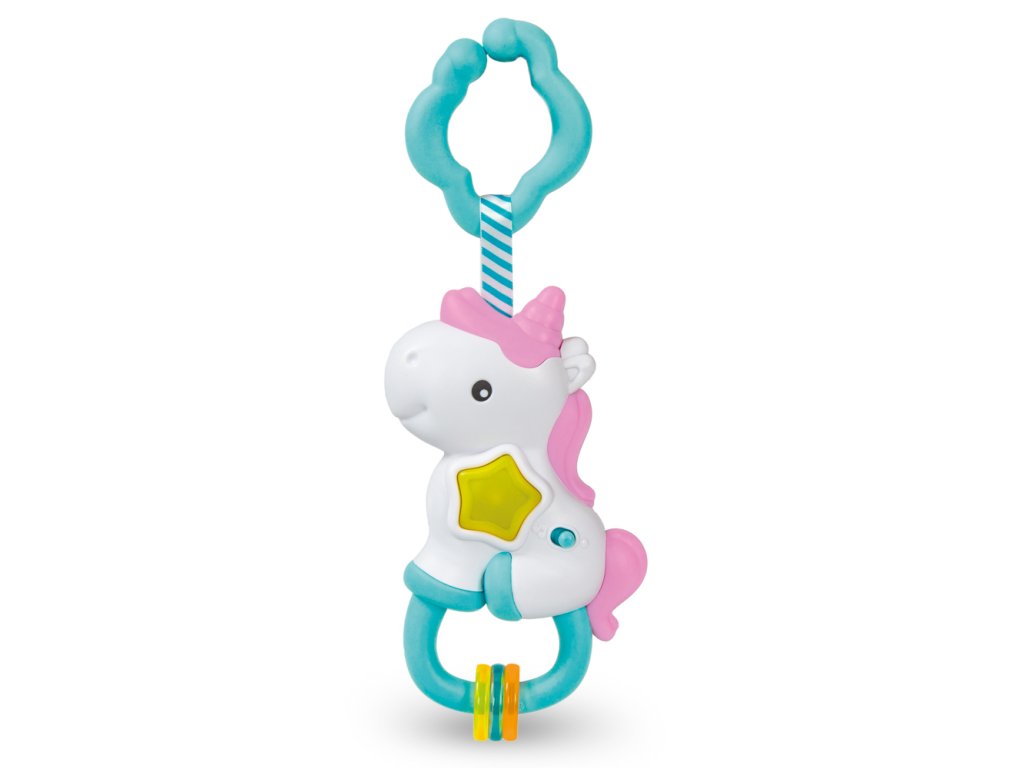Clementoni interaktivní chrastítko jednorožec. Stlačením rozsviť hvězdičku a aktivuj zábavné melodie a zvukové efekty. Praktický kroužek na zavěšení do postýlky, kočárku nebo autosedačky. Chrastítko, přívěsky a různé druhy povrchů podporují rozvoj smyslů dítěte. Vyrobeno z kvalitního a nezávadného materiálu. Baterie: 3 x 1,5V AG13/R44 (součástí výrobku jsou baterie pouze demonstrativní účely). Věk: 3m+