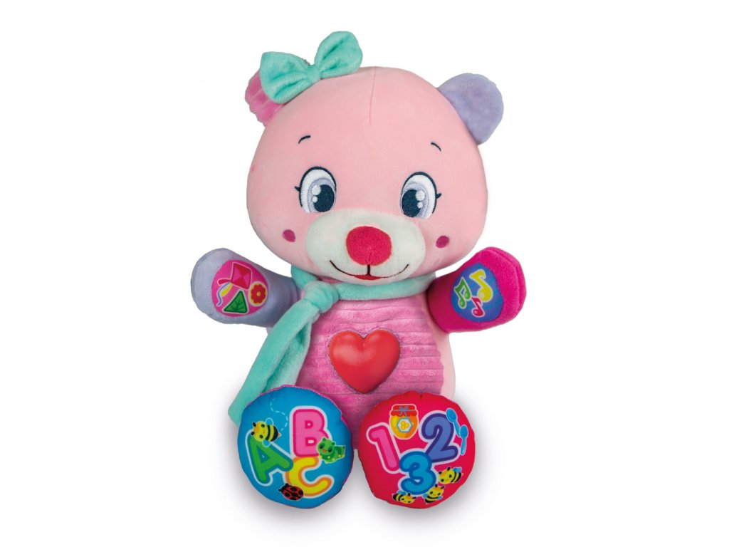 Měkká, plyšová medvědí slečna s 5 interaktivními tlačítky pro učení prvních číslic, tvarů a písmen. Přítulný medvídek děti naučí mnoho nových slov pomocí zábavných písní a říkanek. Srdíčko na hrudi svítí. Výška cca 23 cm. Potřebné baterie: 2 x AAA (jsou součástí balení). Rozměry balení: 25,5 x 30 x 16 cm. Věk: 6m+