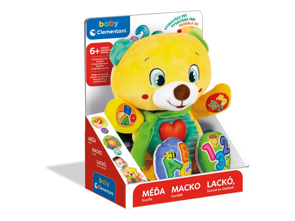 Měkký, plyšový medvídek s 5 interaktivními tlačítky pro učení prvních číslic, tvarů a písmen. Přítulný medvídek děti naučí mnoho nových slov pomocí zábavných písní a říkanek. Srdíčko na hrudi svítí. Výška cca 23 cm. Potřebné baterie: 2 x AAA (jsou součástí balení). Rozměry balení: 25,5 x 30 x 16 cm. Věk: 6m+