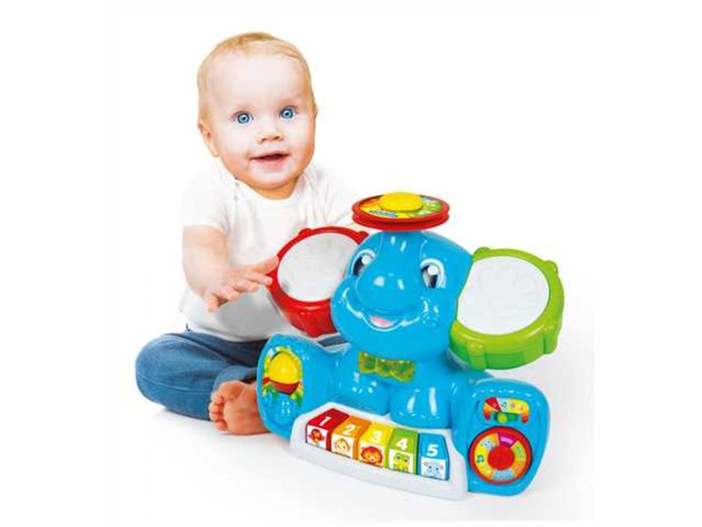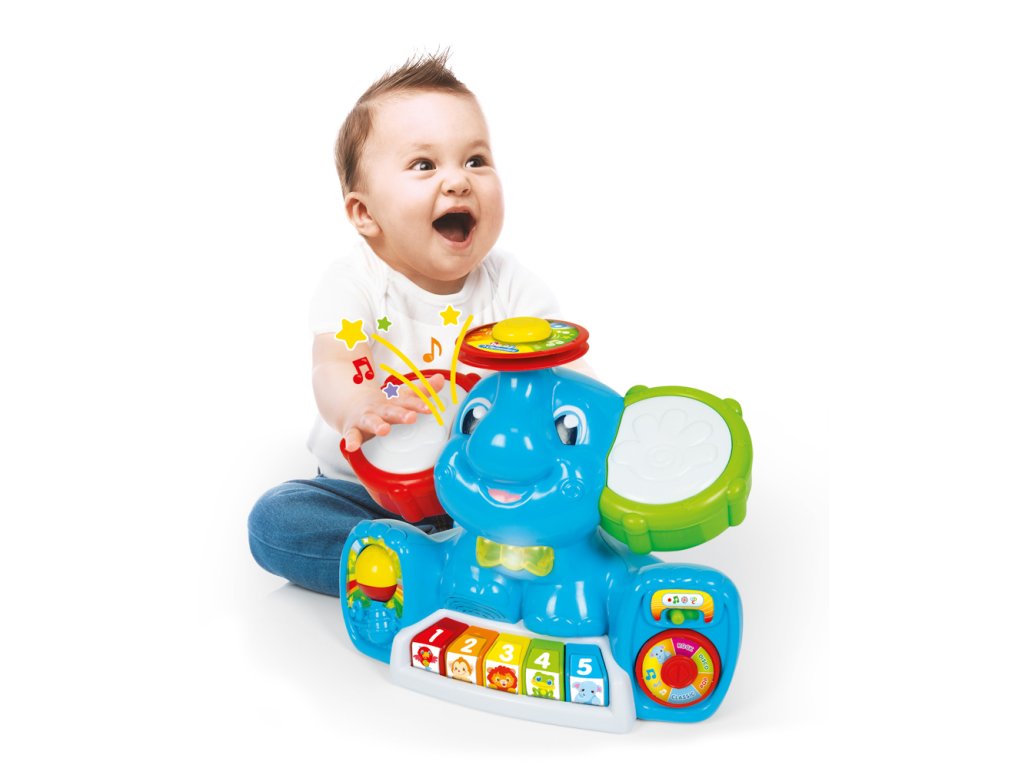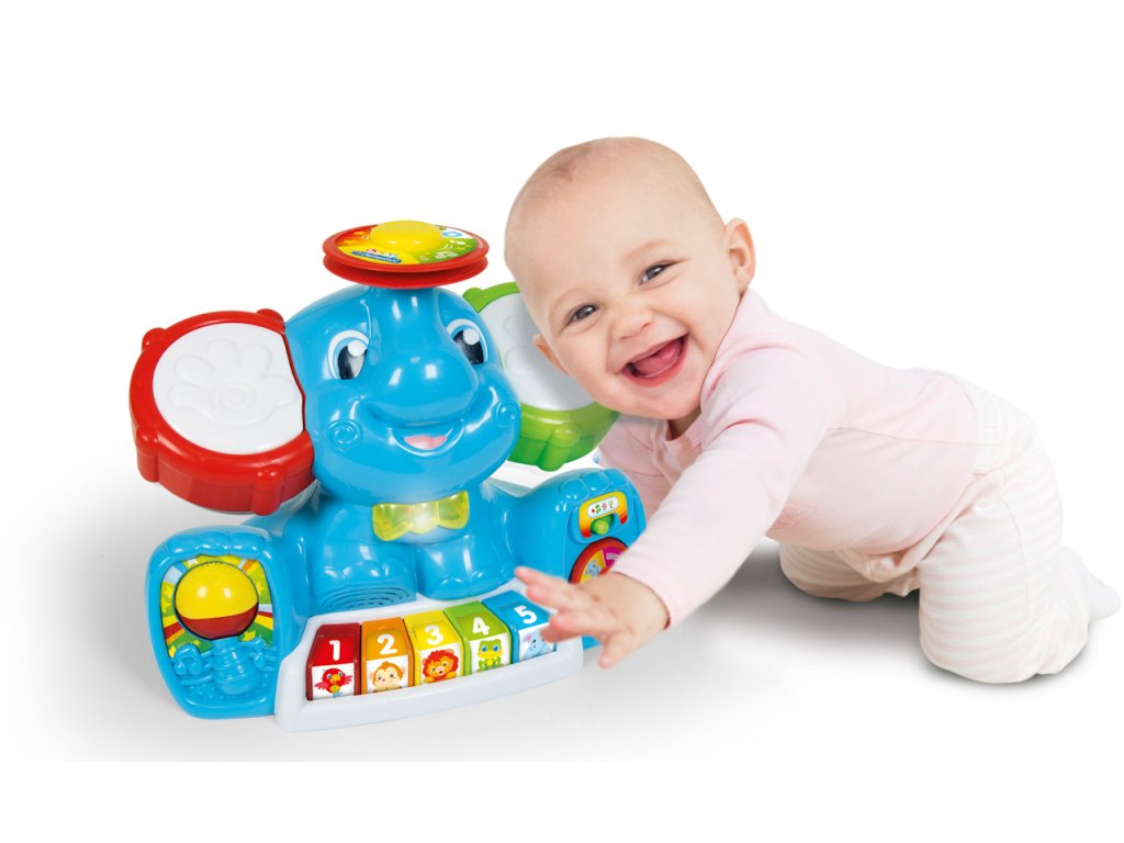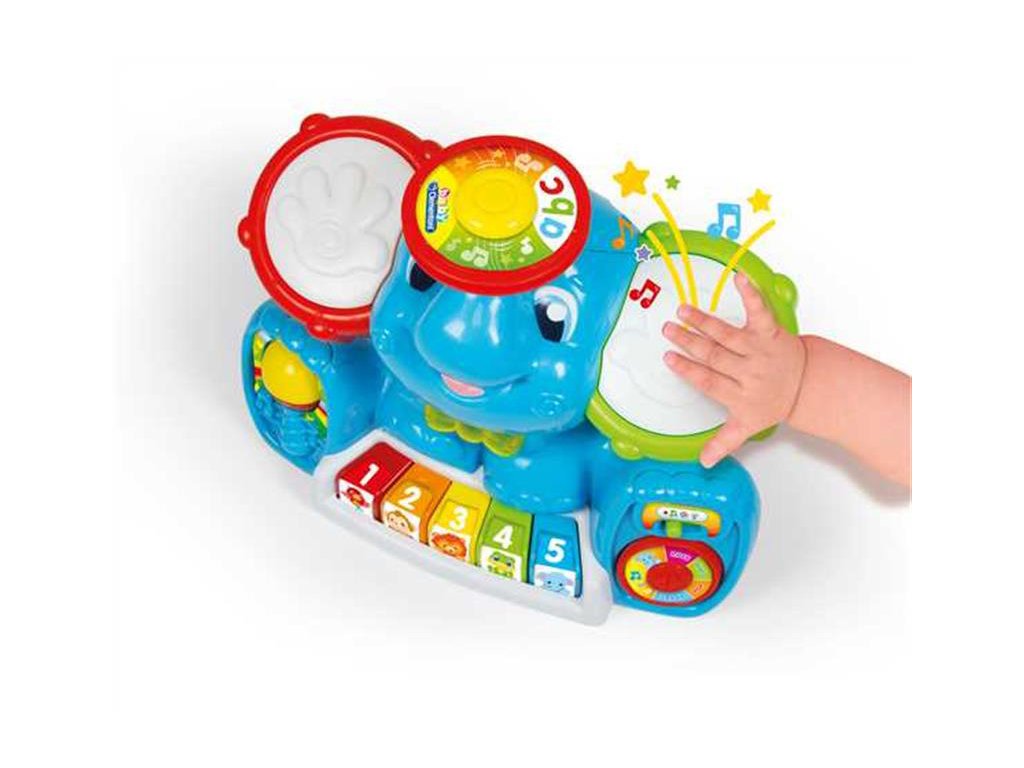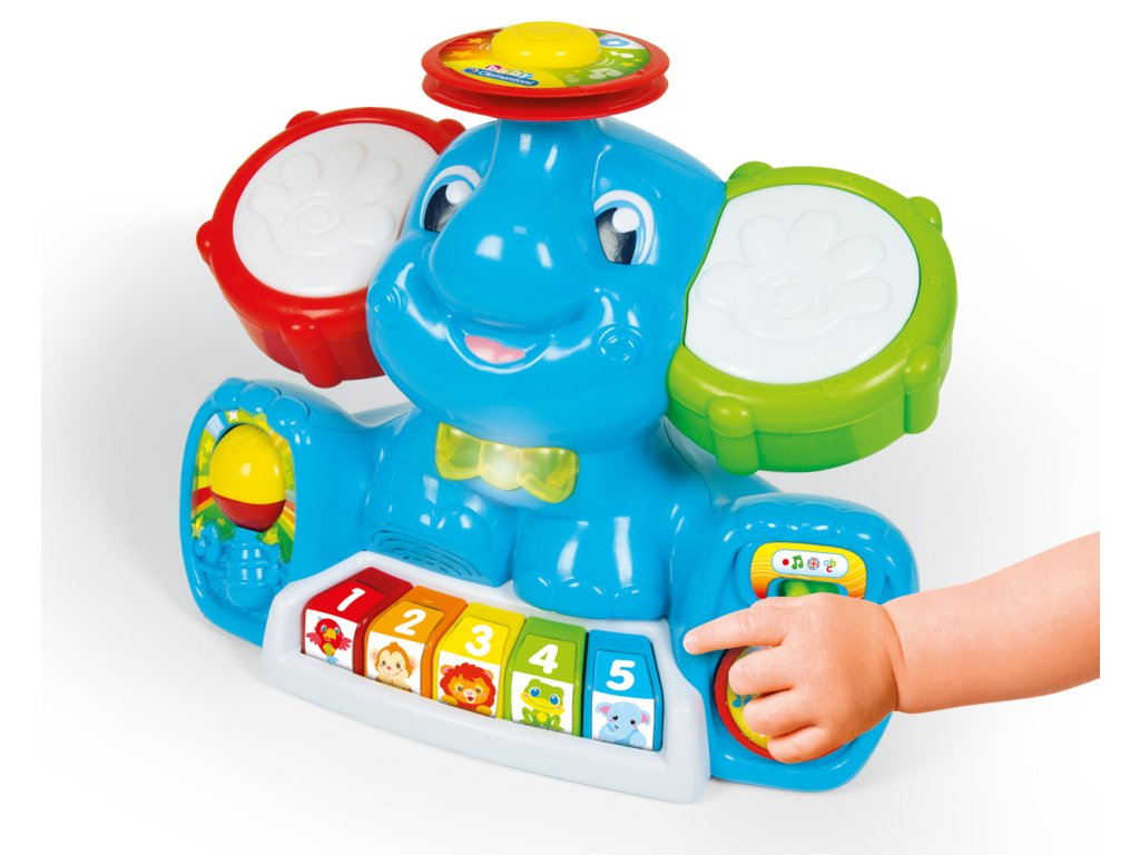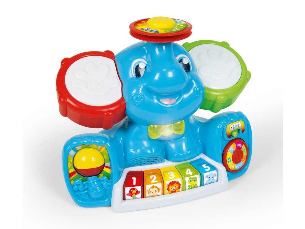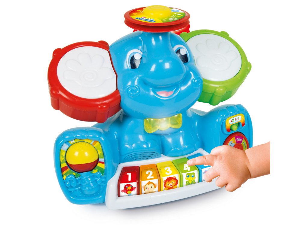 Zábavné centrum plné písní, melodií, zvuků nástrojů. Slon má dvě velké tamburínské uši, barevnou klávesnici, cimbál, motýlek, který se rozsvítí. Učí dítě první písmena, čísla, barvy, jména zvířat a jejich zvuky. Má 4 různé hudební styly: klasický, popový, disko a rockový, které může hrát zvuky 16ti různých nástrojů. V závislosti na typu vybrané hudby se změní zvuk klávesnice, činel a 2 tamburín. Pomáhá rozvíjet manuální, sluchové a vizuální schopnosti. Věk: 10-36 m. | Rozměr: 15,2 x 33 x 27 cm. Video: https://www.youtube.com/watch?v=-76In9CjS-0