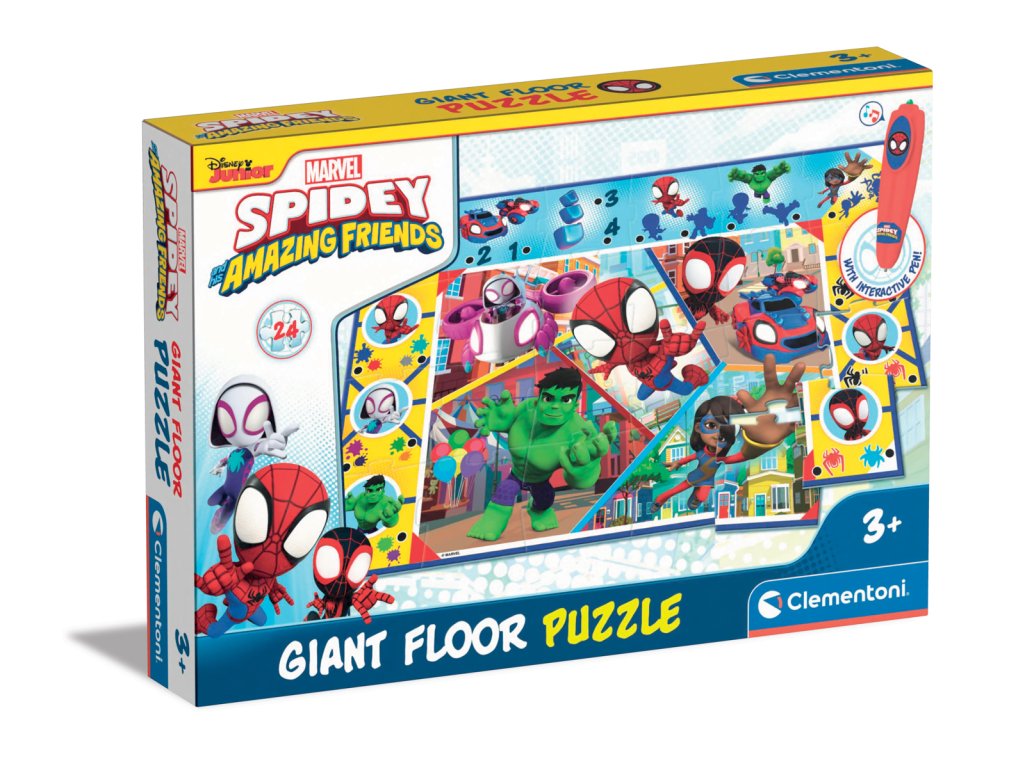 Elektronické a interaktivní 24dílné maxi puzzle, ze kterého se po sestavení stane obří podložka o rozměrech 70 x 100 cm, ilustrovaná Spideym a jeho fantastickými přáteli! Po složení obrázku puzzle si může dítě hrát s elektronickým perem a řešit zábavné kvízy na typická témata předškolního věku. Vzdělávací: učí poznávat první čísla, tvary a barvy, kromě toho, že podněcuje logické a pozorovací schopnosti a manuální dovednosti. Sestavte puzzle tak, že do sebe zasunete dílky podle obrázku na krabici. Po dokončení vezměte elektronické pero a vyřešte kvízy kolem rámečku skládačky tak, že přitisknete hrot pera na černou tečku, která je nejblíže odpovědi, o níž si myslíte, že je správná. Pero vydává zábavný zvukový efekt a LED dioda se rozsvítí pokaždé, když odpovíte správně. Elektronické pero funguje na 3 x 1,5V baterie LR41/L736 (jsou součástí balení). Rozměry balení: 45,1 x 31,1 x 7 cm Věk: 3+