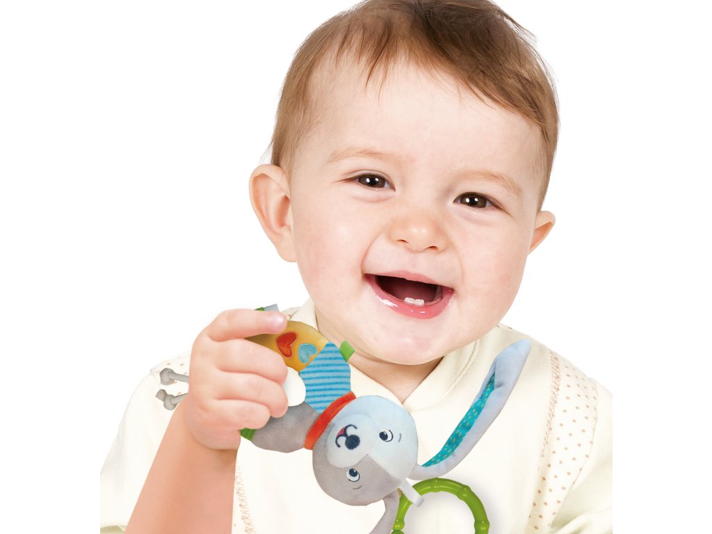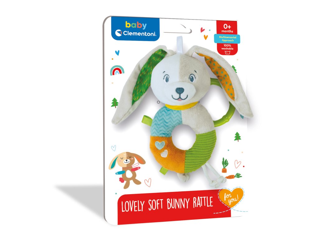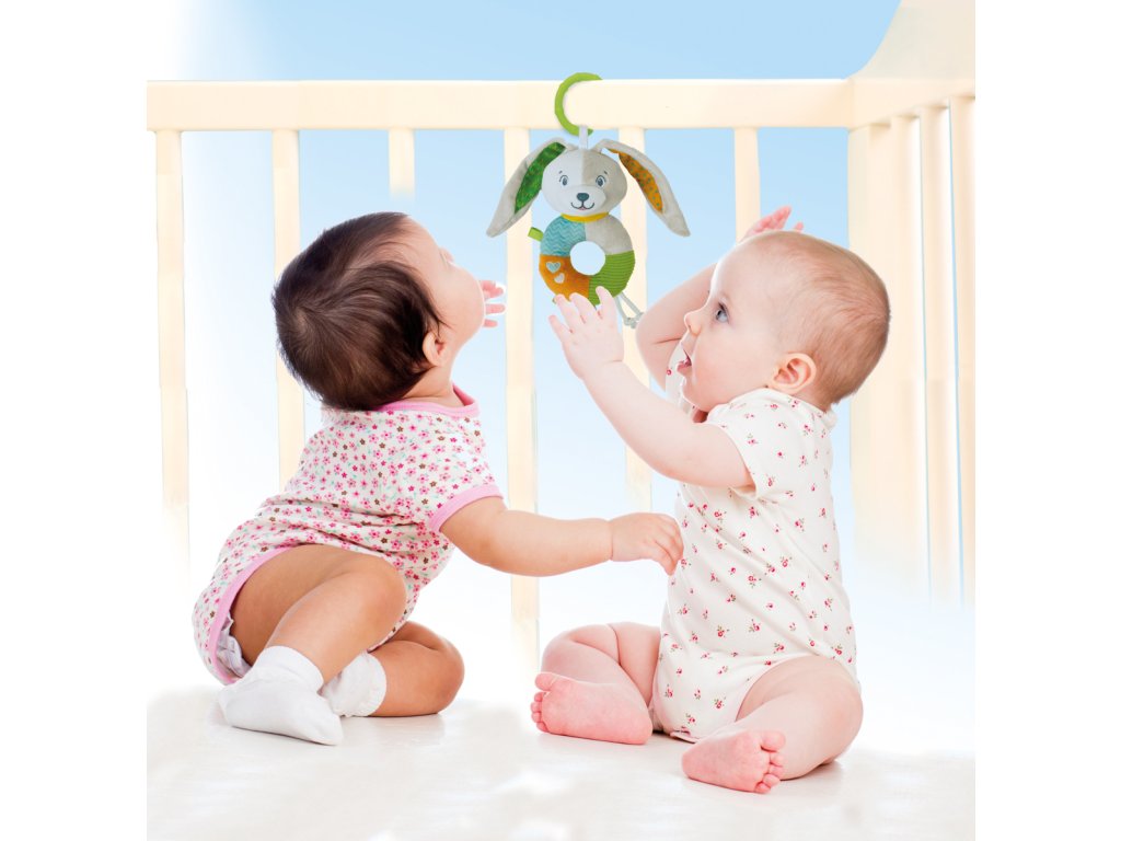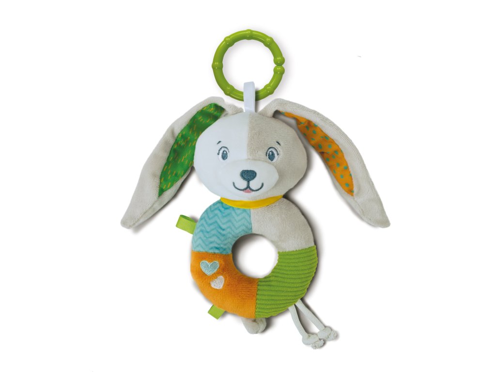 Měkký chrastící zajíček k pomazlení! Snadno uchopitelný zajíček je ideální pro stimulaci a zábavu těch nejmenších. Díky různým tkaninám a jasným barvám podporuje rozvoj zrakového vnímání, sluchu a obratnosti. Praktický kroužek lze zaháknout v několika bodech, abyste zajíčka kamkoli zavěsili a nosili ho stále u sebe. Balení: 6x18x25cm. Věk: 0+