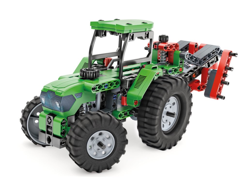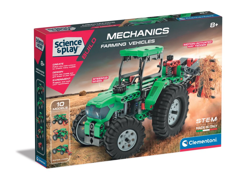 Vědecká sada pro zábavu při objevování vědy s provozem zemědělských strojů. Stavebnice obsahuje více než 240 dílků, ze kterých lze vyrobit a sestavit 10 různých dynamických modelů. Ilustrovaný manuál vysvětluje, jak sestavit modely, a obsahuje některé poznatky o principech mechaniky a inženýrství. Spousta speciálních dílů, jako je diferenciál, ozubená kola, kardanový kloub a mnoho dalších, umožňuje experimentovat s vozidly a pochopit, jak fungují. Aplikace „Science & Play Build“ integruje herní zážitek tím, že poskytuje montážní pomůcku pro všechny modely díky interaktivním 3D animacím. Rozměr balení: 27,8x39,6x6 cm. Věk 8+