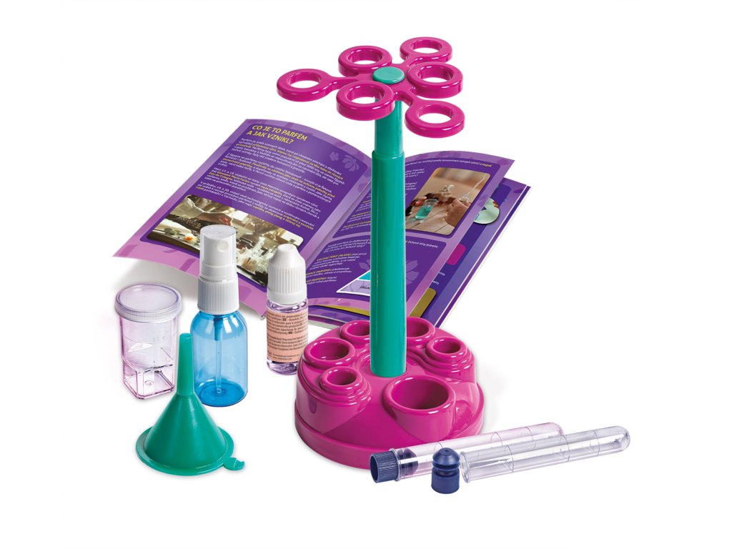 Malá vědecká laboratoř k sestavení, experimentování a výrobu parfémů. Sada obsahuje vůně a veškeré příslušenství, včetně lahviček s rozprašovačem, odměrné kádinky, nálevky, pipety a míchadla, potřebné pro experimenty. Konstrukce umožňuje zavěšení zkumavek a míchat výtvory. Dívčí laboratoř pro vytváření fantastických personalizovaných parfémů, parfémových difuzérů a aromatických olejů a zároveň stimulovat dívčí kreativitu. Podrobný manuál pomůže dítěti objevit vědu. Rozměr balení: 15x21x5,5 cm. Věk 8+