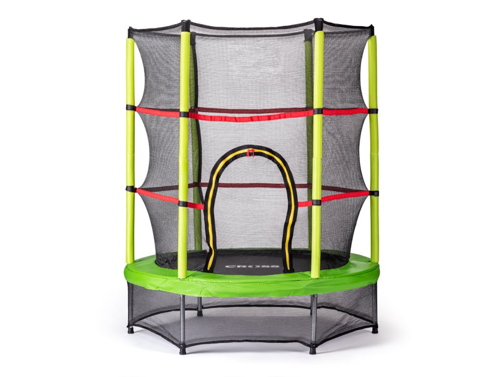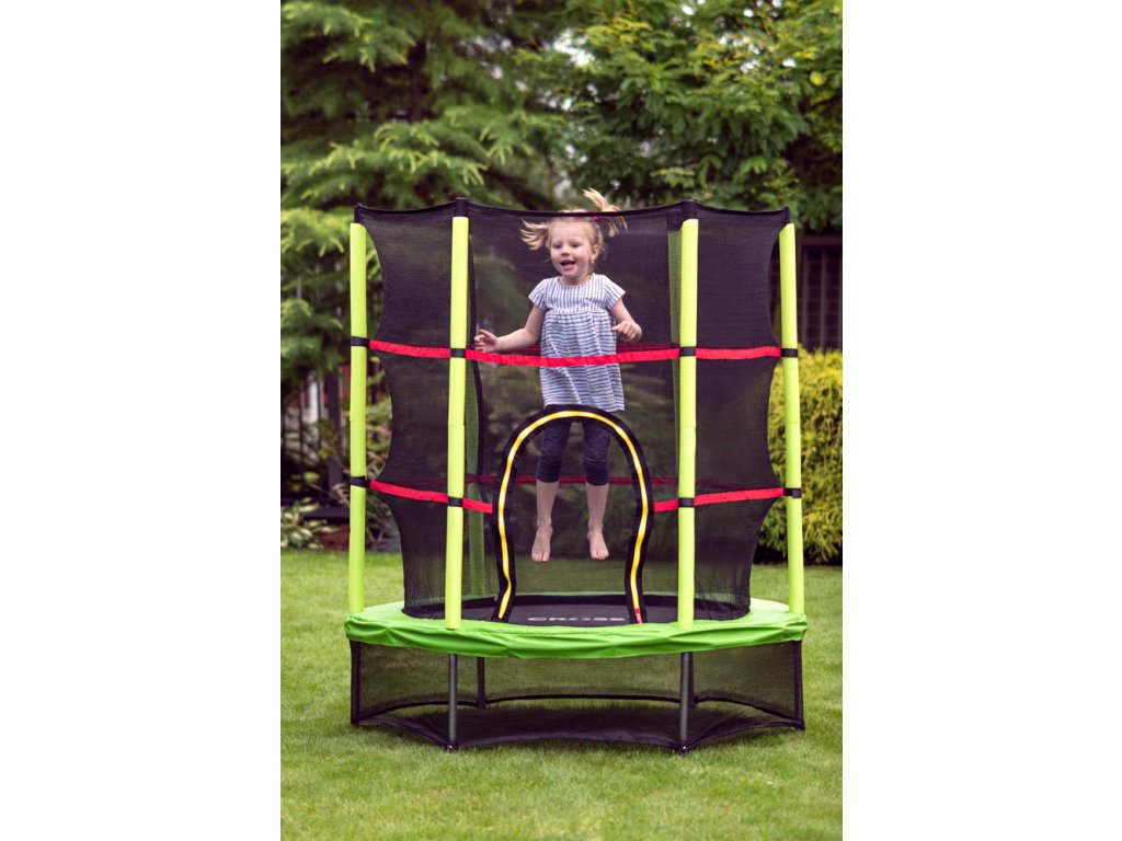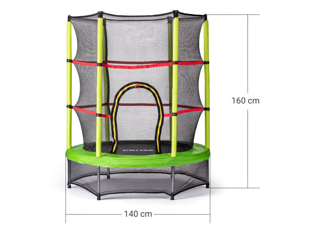 Trampolína je vybavena ochranou sítí v níž je otvor pro vstup na skákací plochu. Otvor je zajištěn zipem tak, aby dítě bylo po celou dobu skákání jištěno proti vypadnutí ze skákací plochy. Odrazná plocha trampolíny je upevněna k rámu systémem pevných a odolných gum. Tento systém je chráněn límcem a stojné tyče jsou obaleny pěnovou gumou. Trampolína má ochrannou síť i kolem nohou, aby bylo zajištěno, že během skákání další dítě nepodleze pod trampolínu a nedojde tak k jeho zranění.| Rozměr: 140 x 160 cm | Věk: 3+