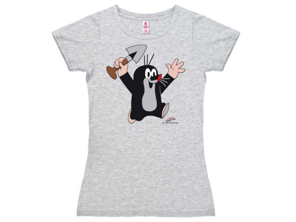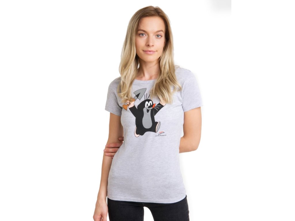 Dámské tričko s krátkým rukávem v šedé barvě s motivem Krtečka, který kope do země. Přiléhavý střih, příjemný bavlněný materiál, vhodné na volný čas i každodenní nošení.