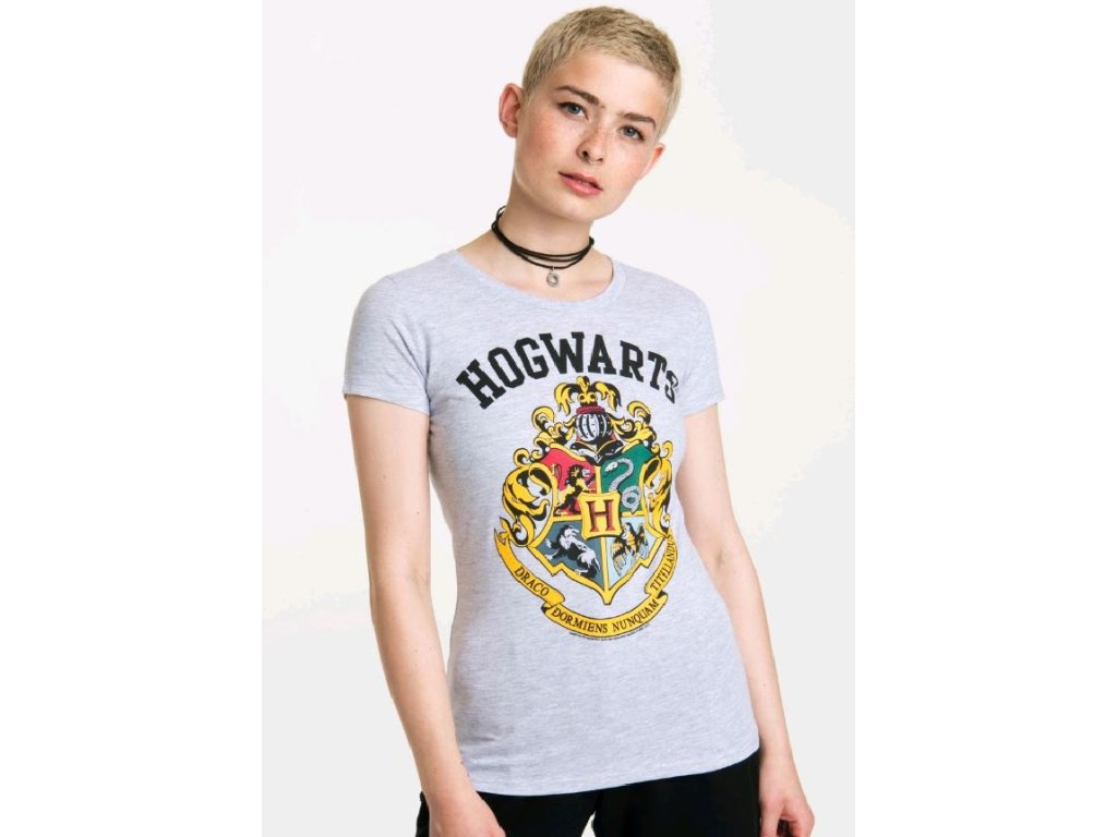 Šedé dámské tričko s grafikou a hlavním logem školy čar a kouzel v Bradavicích (Hogwarts logo).