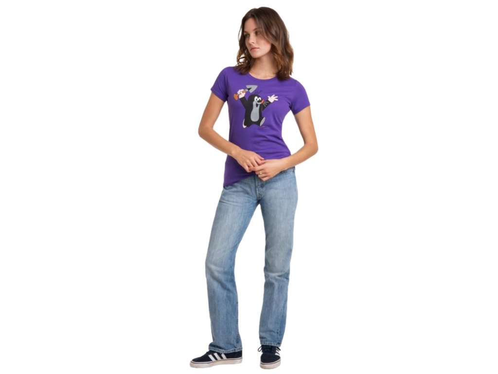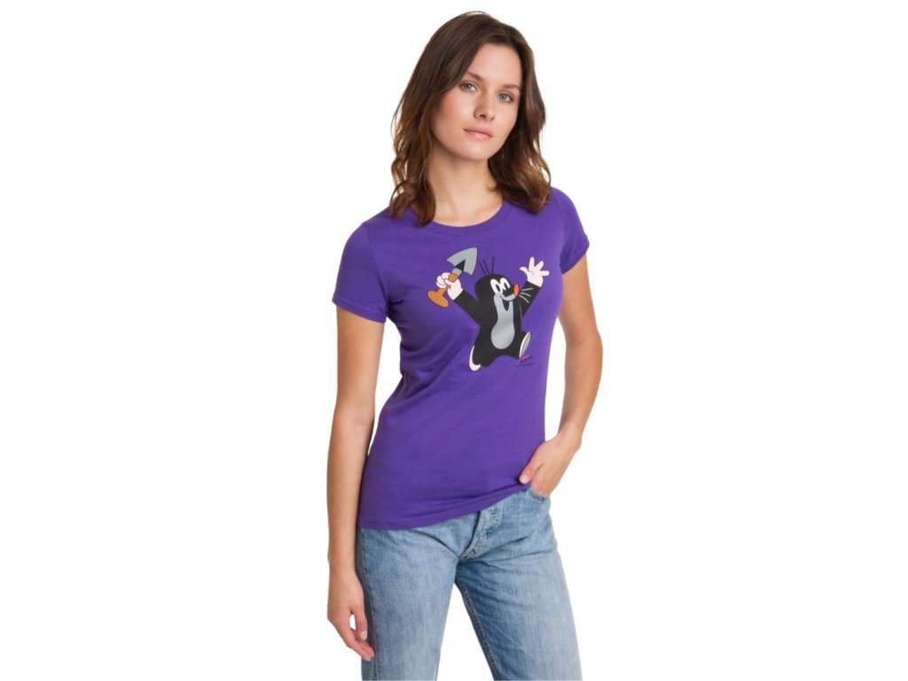Bavlněné fialové tričko s grafikou Krtečka s rýčem ve veselém běhu. Atraktivní tričko je i vhodným dárkem pro všechny menší i větší fanoušky této postavičky, kteří chtějí mít Krtečka stále u sebe. Ukažte i vy svůj styl a hravost s tímto stylovým fialovým tričkem s Krtečkem.