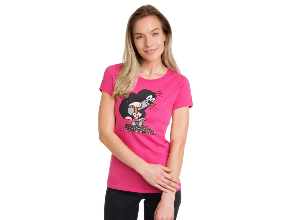 Dámské tričko s krátkým rukávem v růžové barvě s motivem Krtečka, který kope do země. Přiléhavý střih, příjemný bavlněný materiál, vhodné na volný čas i každodenní nošení.