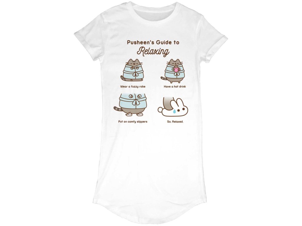 Bílé dámské tričko inspirované grafikou kočky jménem Pusheen a nápisem Pusheen's Guide to Relaxing.