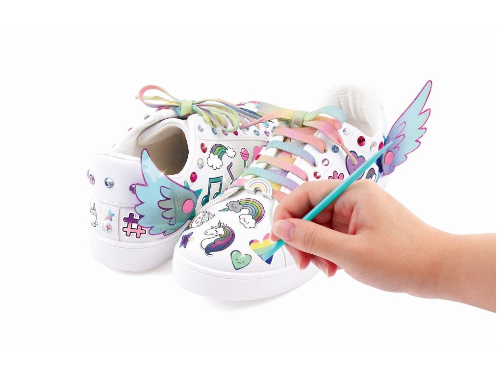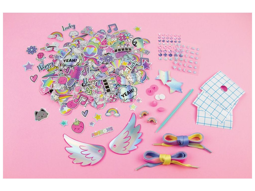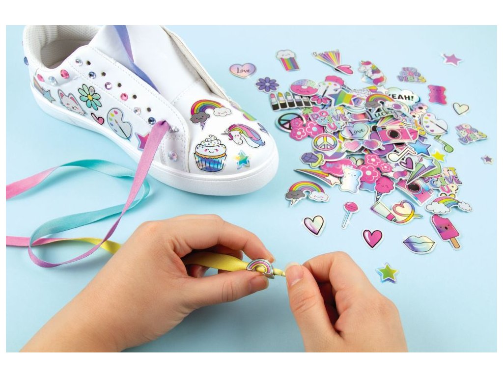 Dočasné tetování pro vaše boty. Dodejte své obuvy šmrnc pomocí dekorativních samolepek. Přidejte jich jen trochu nebo hodně. Proměňte své boty znovu a znovu. Zahrnuje korálkové přívěsky a tkaničky do bot. Přebytečné množství odstraňte teplou vodou. Věk od 8+.