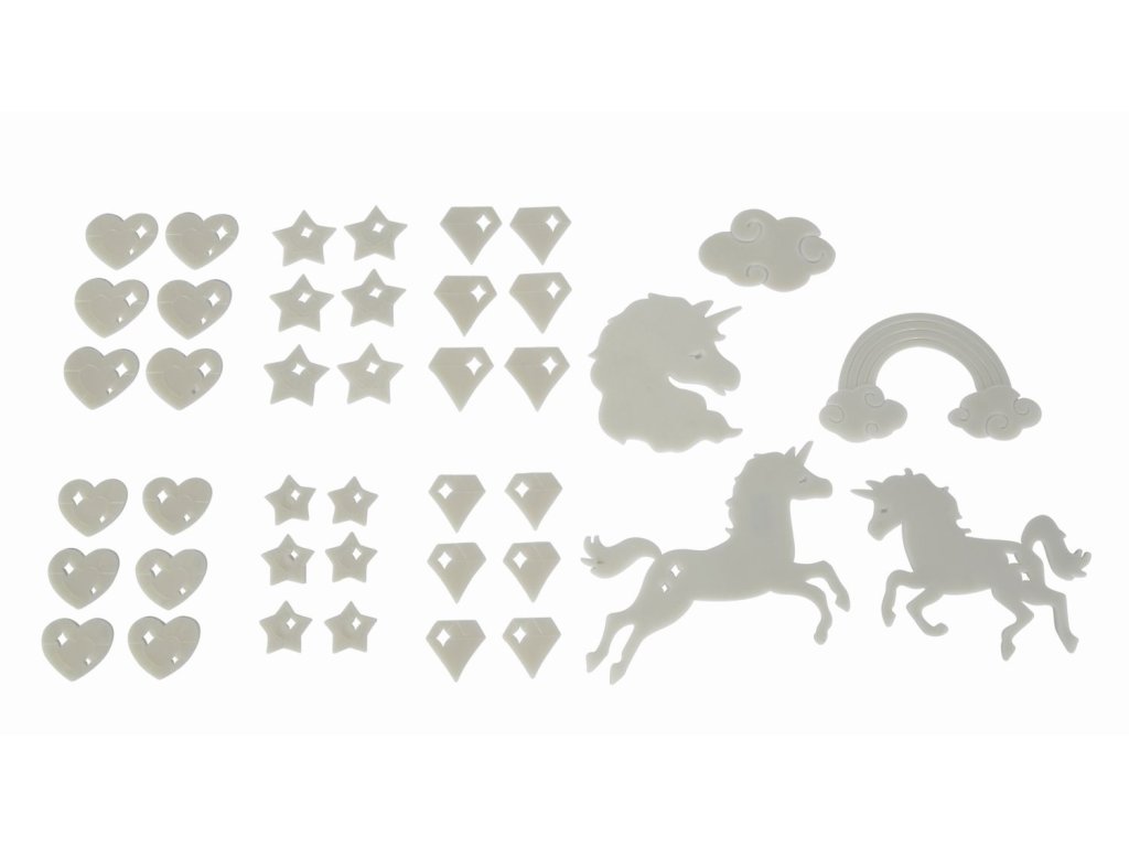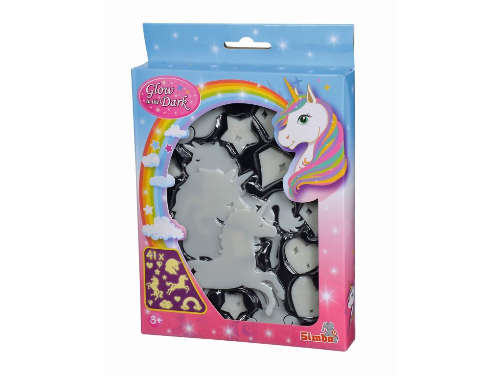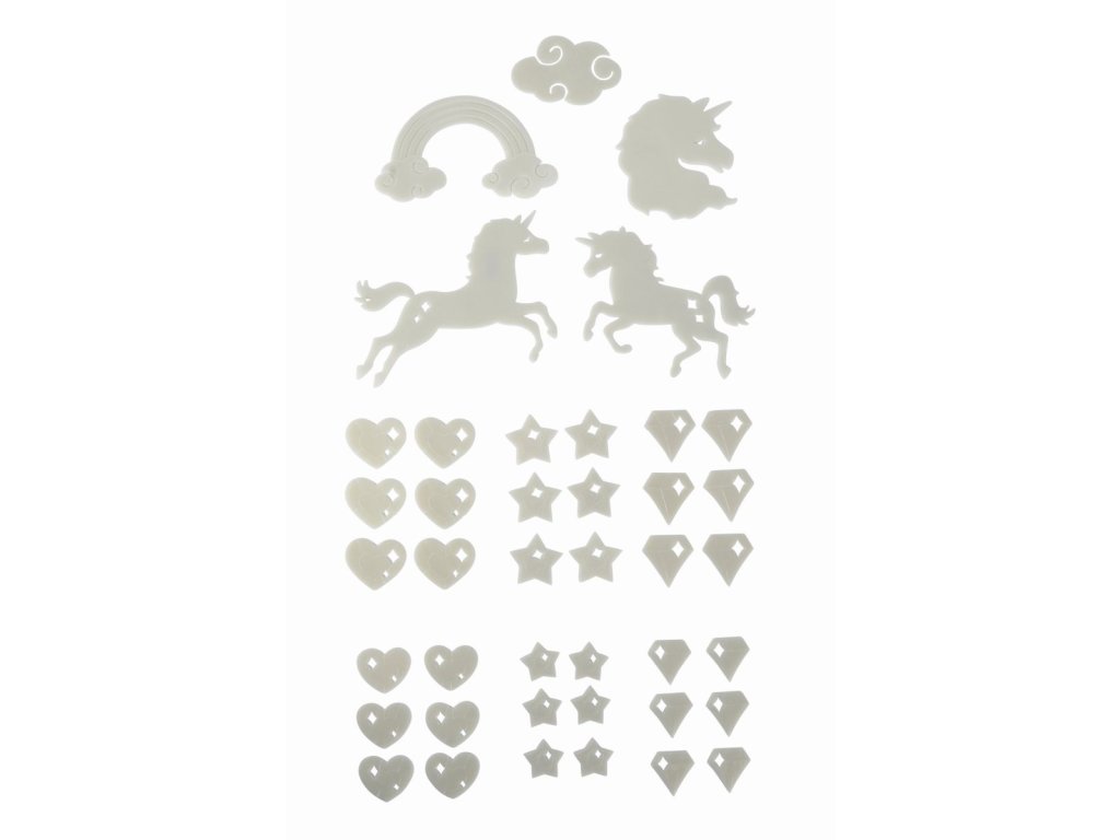 Sada fluorescenčních jednorožců a dalších motivů, které po nasvícení ve tmě svítí. Dekorace vhodná k nalepení na stěnu, strop či nábytek. Včetně lepicí gumy. Sada obsahuje 41 ks.