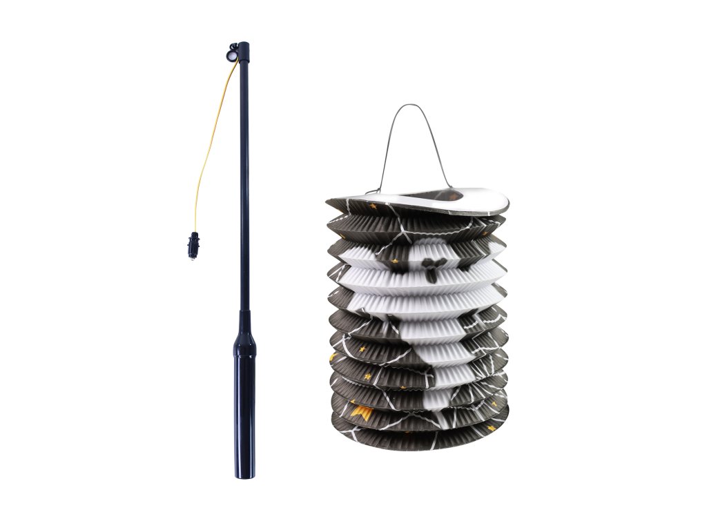 Papírový lampion s motivem ducha a k němu svítící hůlka! Oválný lampion je vyroben z papíru a ve spodní části se nachází úchyt pro čajovou svíčku. Tento super kousek ti zaručí parádní atmosféru na tvém halloweenském večírku nebo lampionovém průvodu! Hůlka vyžaduje 2 tužkové baterie typu AA, které nejsou součástí balení. Přepnutím spínače na rukojeti hůlka svítí.
