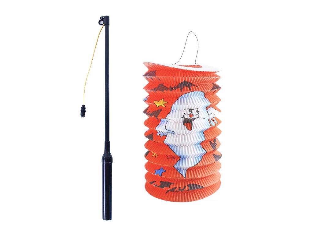 Papírový lampion s motivem ducha a k němu svítící hůlka! Oválný lampion je vyroben z papíru a ve spodní části se nachází úchyt pro čajovou svíčku. Tento super kousek ti zaručí parádní atmosféru na tvém halloweenském večírku nebo lampionovém průvodu! Hůlka vyžaduje 2 tužkové baterie typu AA, které nejsou součástí balení. Přepnutím spínače na rukojeti hůlka svítí.