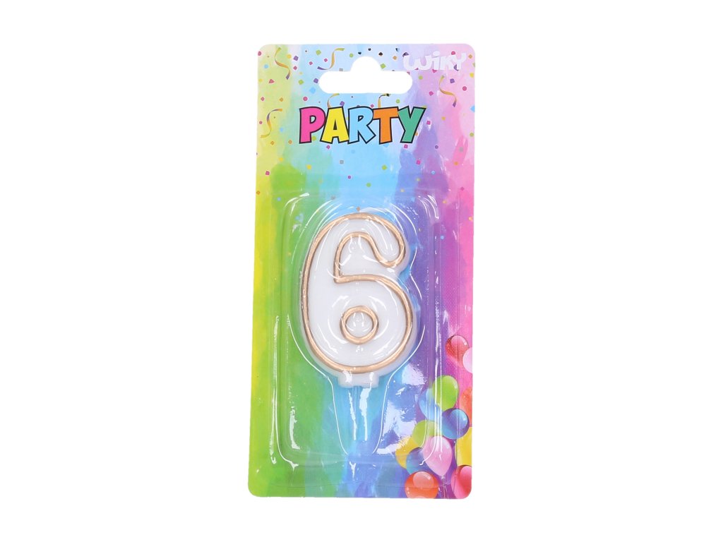 Bílá svíčka se zlatým lemem ve tvaru čísla se stojánkem z vosku pro pohodlné a pevné umístění na dort.