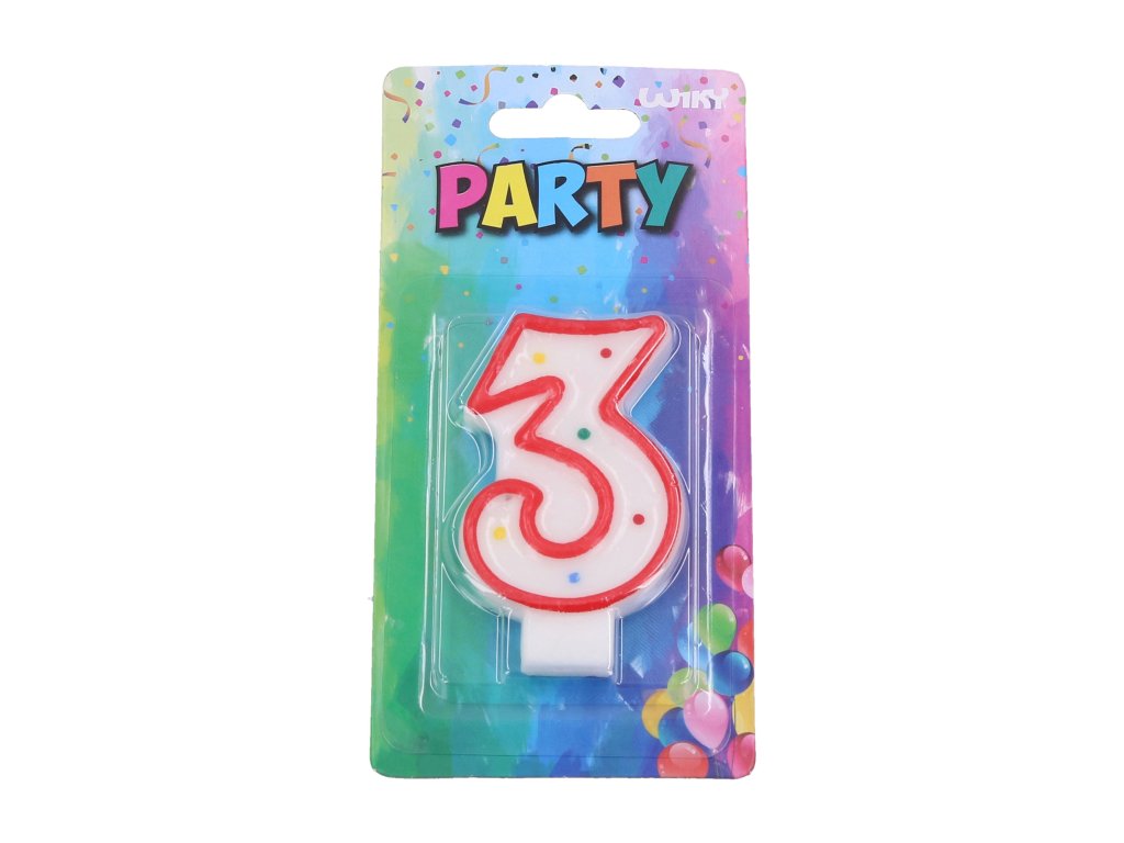 Party svíčka - číslo 3 - bílá s červenými okraji a barevnými puntíky