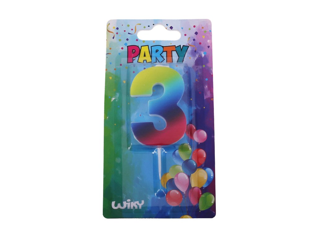 Narozeninová svíčka duhová číslo 3 se stojánkem z vosku pro pohodlné a pevné umístění na dort. Svíčky nejsou určené ke konzumaci.