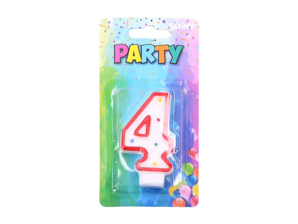 Party svíčka - číslo 4 - bílá s červenými okraji a barevnými puntíky