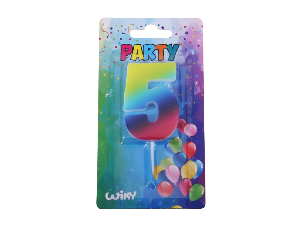 Narozeninová svíčka duhová číslo 5 se stojánkem z vosku pro pohodlné a pevné umístění na dort. Svíčky nejsou určené ke konzumaci.