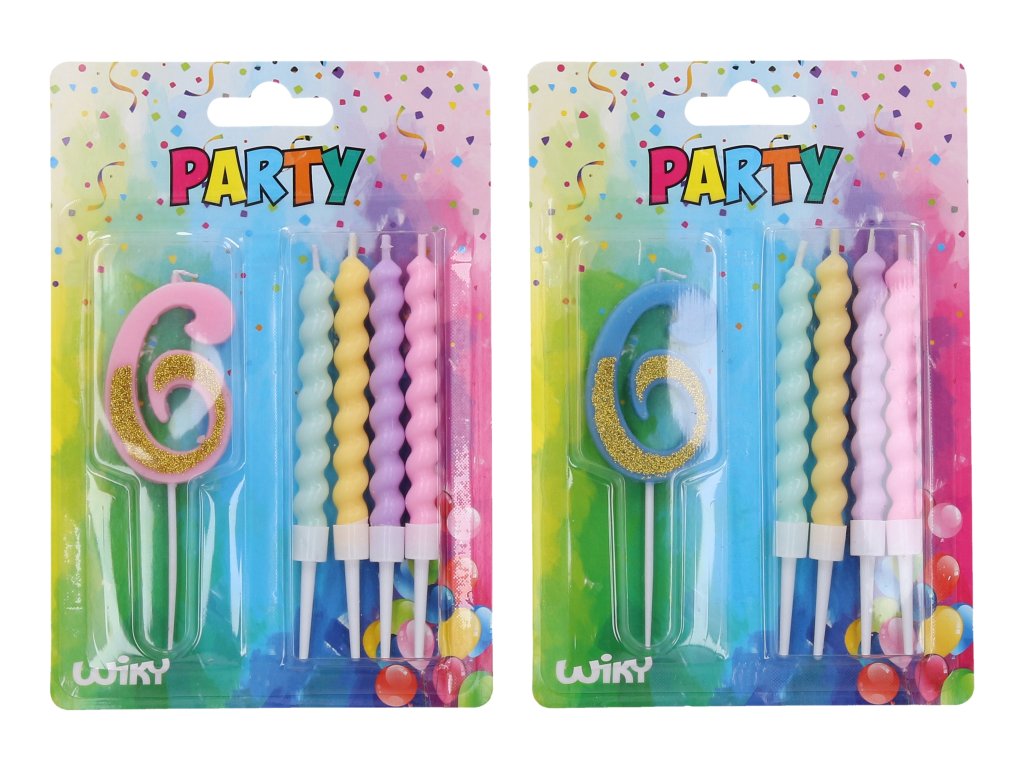 Párty svíčka číslo 6 + 4ks svíček. 2 barevné varianty - modrá, růžová.