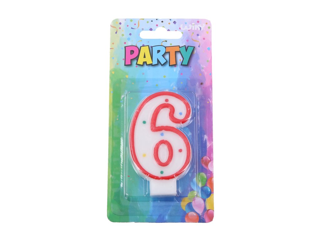 Party svíčka - číslo 6. - bílá s červenými okraji a barevnými puntíky.
