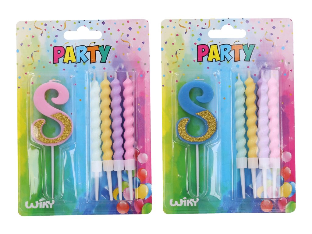 Párty svíčka číslo 8 + 4ks svíček. 2 barevné varianty - modrá, růžová.