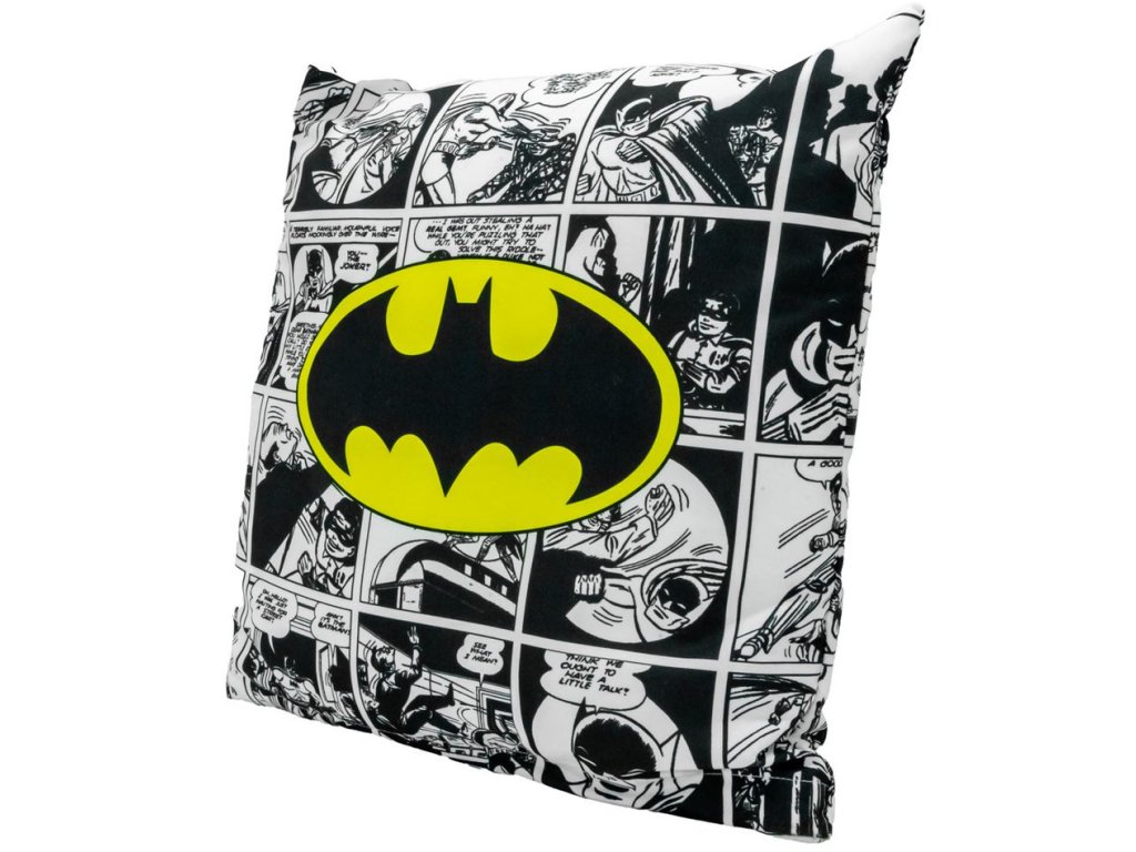 Černo-bílý polštář vyveden s grafikou komiksových ikon a loga Batmana. Polštář je vhodným dárkem pro každého menšího i většího fanouška, který chce i v noci být připraven na záchranu města s Batmanem.