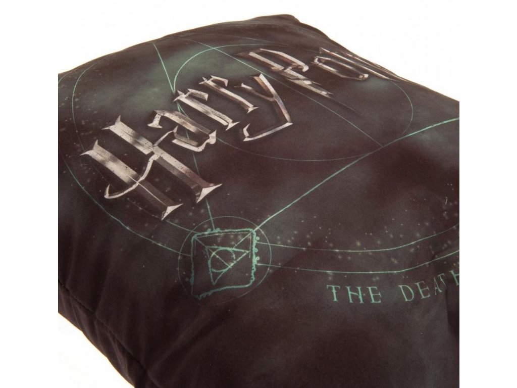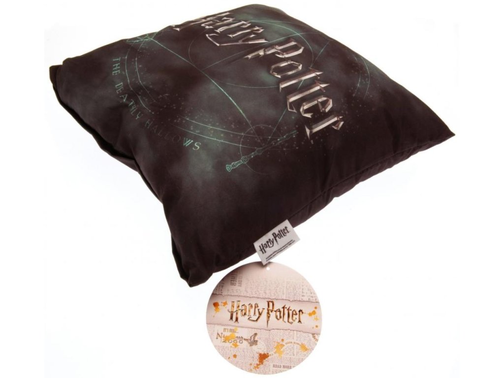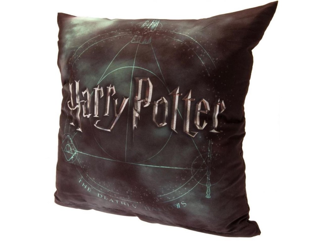 Černo-zelený polštář vyveden s grafikou siluety kouzelných předmětů relikvie smrti (Deathly Hallows). Polštář je vhodným dárkem pro každého menšího i většího fanouška Harryho Pottera. Polštář lze prát v pračce.