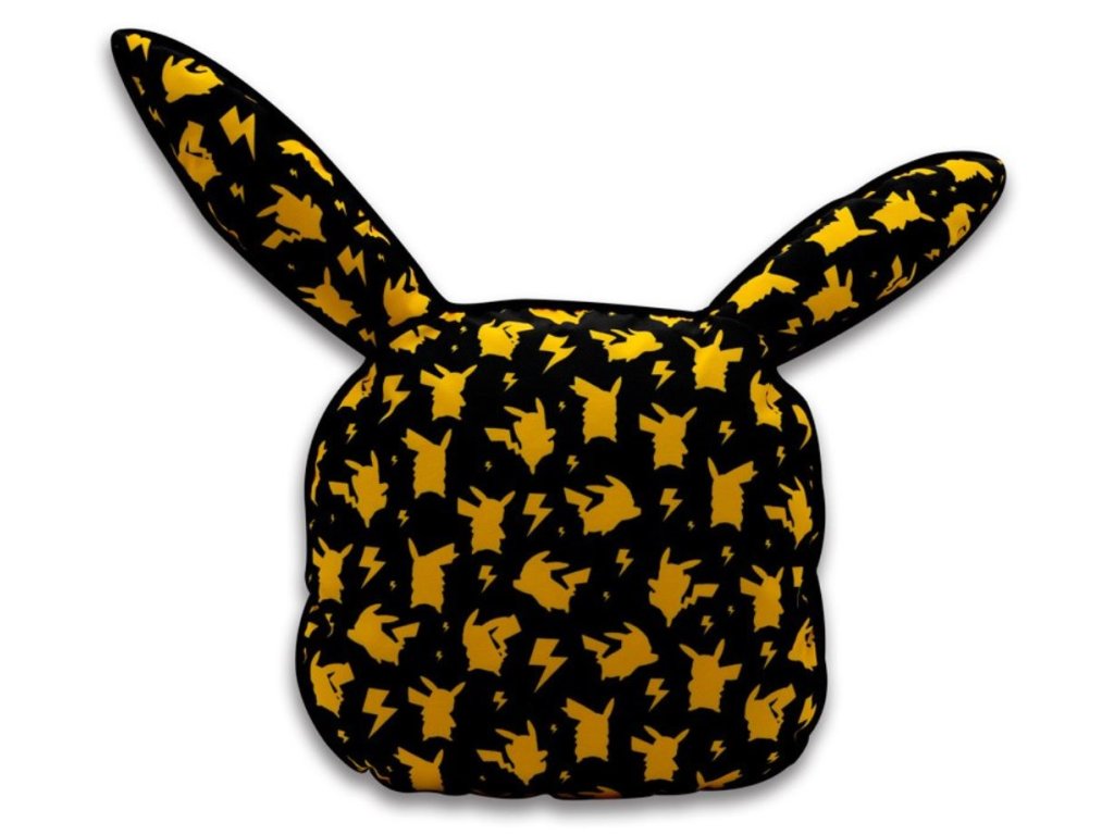Prakticky použitelný i dekorativní oboustranný polštář vyvedený z jedné strany v grafice populárního bleskového pokémona jménem Pikachu a z druhé strany je černý a jsou tam siluety Pikachua a blesky.
