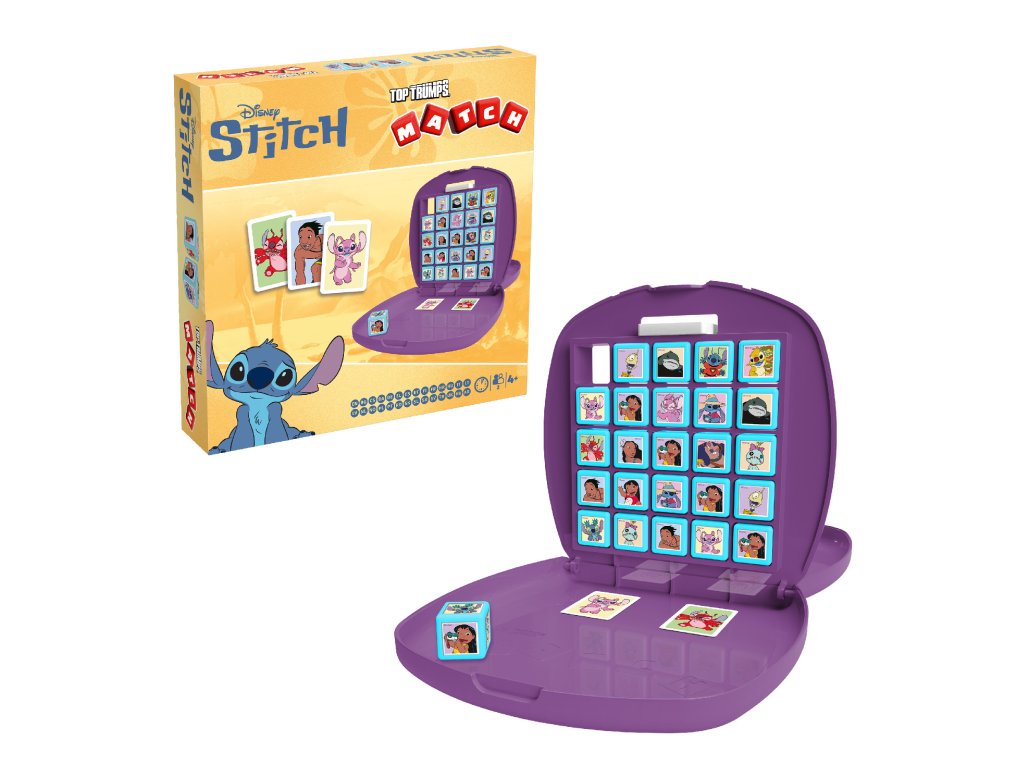 Lilo & Stitch Match desková hra. Desková hra pro 2 hráče. V plastovém kufříku na cesty. Snažte se uspořádat obrázky na kostičkách tak, abyste utvořili horizonální, vertikální, nebo diagonální řadu tvořenou ze stejných obrázků. Velikost rozloženého kufříku (herní plochy) - 41x26,5x20,8 cm.