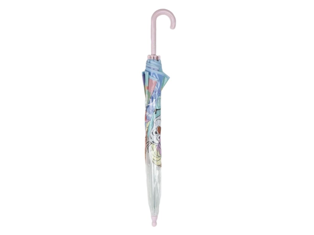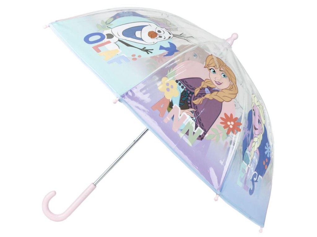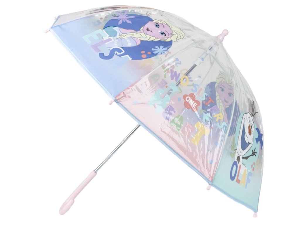 Manuální deštník v průhledné barvě s designem a barevnými detaily sester Elsy a Anny a sněhuláka Olafa z pohádky Ledové Království (Frozen). Deštník má plastovou ohnutou rukojeť pro lepší držení. S tímto deštníkem budou chtít jít všechny děti ven za jakéhokoliv počasí!
