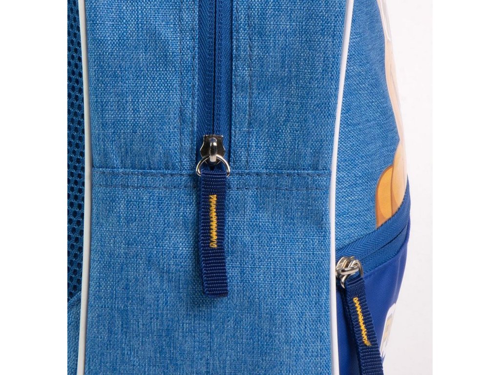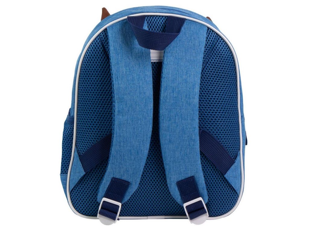 Dětský jednoprostorový modrý batoh s boční síťovanou kapsou na láhev, délkově nastavitelné popruhy, ucho pro nošení v ruce, menší přední kapsa na drobnosti a jmenovka na vepsání jména majitele batohu. Lehce polstrovaná záda. Vhodný na každodenní nošení do školy i do města.