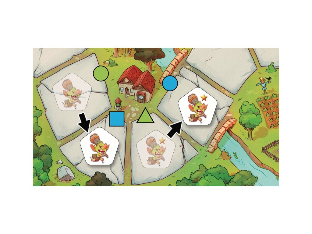 Monstrum chytíte tak, že zahrajete kartu se stejným tvarem a barvou, jakou má políčko s monstrem.