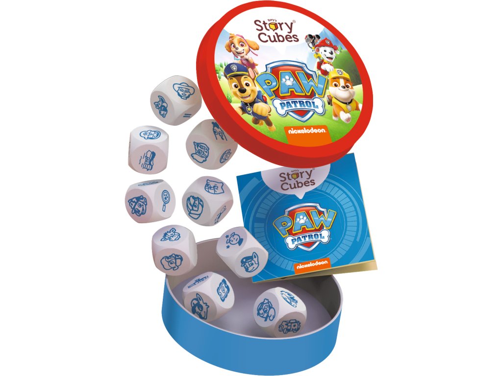 9 kostek se symboly Paw Patrol v praktické plechová krabička