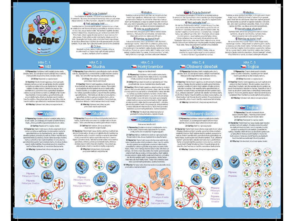 Hra nabízí zcela unikátní zábavu. Hráči zde hledají dva stejné symboly na kartách při různých verzích hry (v pravidlech je popsáno celkem 5 her). Super jsou kulaté karty i jednoduchá pravidla vysvětlená doslova za pár sekund. Cílová skupina jsou děti i rodiče - všichni, kdo se chtějí pořádně bavit a nemají čas pročítat dlouhá pravidla. Plechová krabička zaručuje bezpečí karet a jednoduše umožňuje mít hru vždy u sebe. Vyzkoušejte i Vy postřehový fenomén Dobble a jistě budete překvapeni, jak i tak jednoduchá hra může být zábavná!