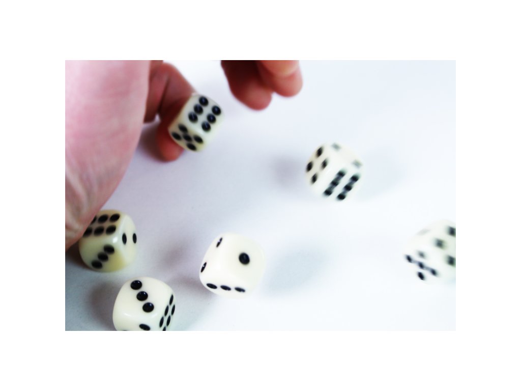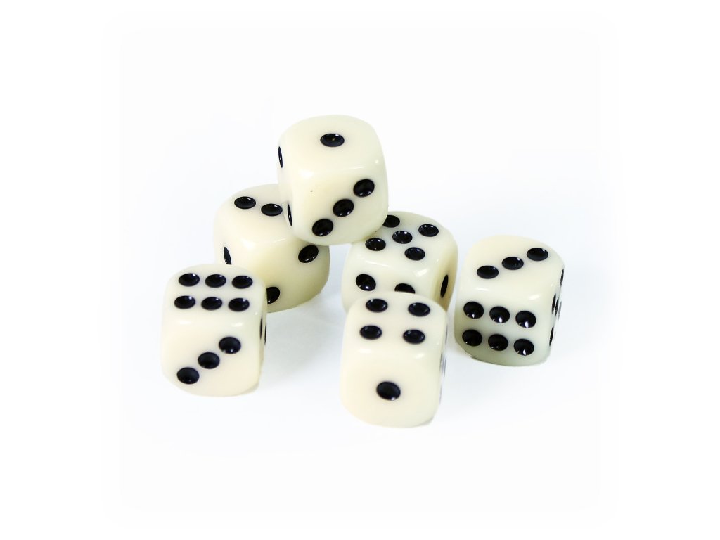 Hrací kostky barvy slonová kost, s kterými si zahrajete mnoho zajímavých a zábavných her. Balení obsahuje 6 ks kostek.